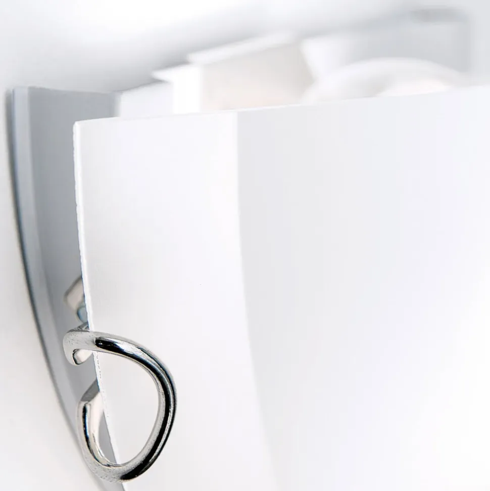 Agada opalglas-væglampe i halvcirkelform Agada-væglampen er defineret af en halvcirkelformet skærm af opalglas, der åbner sig opad. Små dele af stålholderen er synlige på siderne, hvilket giver væglampen moderne kromaccenter.