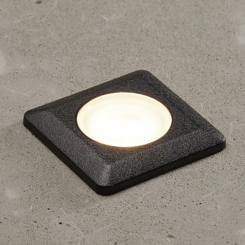 Den vinkelforsænkede indbygningslampe Aldo udsender LED-lampens varmhvide lys direkte gennem et fladt låg lavet af klart polycarbonat. Den kan installeres inde og ude i gulvet eller i væggen og er ideel til f.eks. At belyse en veranda.