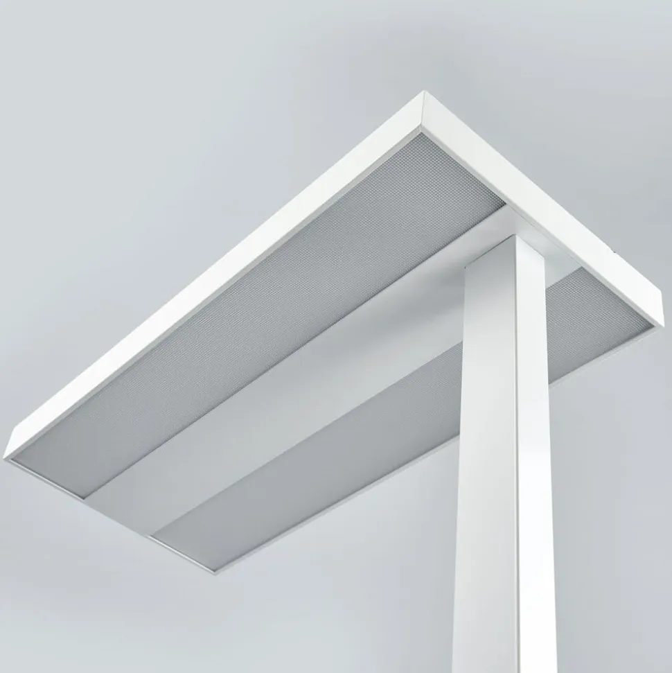 Optimal, trinløs belysning af arbejdspladsen kombineret med klassisk design – den hvide Logan LED-gulvlampe til kontor Med funktionalitet og teknisk design supplerer den hvide Logan gulvlampe diskret kontorets belysningskoncept. Det sofistikerede samspil mellem direkte og indirekte lys gør det muligt for denne blændfri LED-arbejdslampe at give en omfattende belysning af skrivebordet med lav kontrast takket være prismeteknologi. Den trinløst justerbare lysstyrke og lysfarven i dagslys bidrager til træthedsfrit arbejde under behagelige lysforhold. Den U-formede base giver mulighed for pladsbesparende opbevaring og sikrer samtidig en sikker stand. Med sit solide, funktionsorienterede design er denne gulvlampe til kontoret af høj kvalitet en meget nyttig tilføjelse til arbejdsstationer på kontoret – flimmerfri – UGR < 19