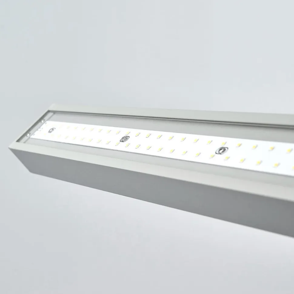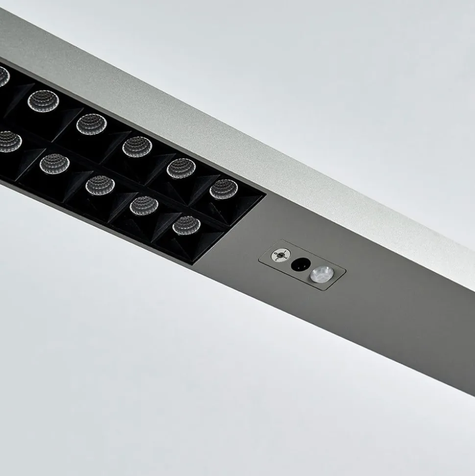 Funktionel LED-gulvlampe til kontor Jolinda med dagslyssensor, bevægelsessensor, dæmper og direkte/indirekte belysning Jolinda har et minimalistisk, meget moderne udseende, da gulvlampen stort set kun består af to smalle bjælker, der er placeret i rette vinkler i forhold til hinanden. Lyset skinner opad og nedad, stort set uden at blænde nedad, hvilket giver en meget behagelig lysoplevelse, som er perfekt til lange perioder med koncentreret arbejde ved skrivebordet. LED-gulvlampen er velegnet til at oplyse et skrivebord, som så forsynes med stærkt lys. Det høje funktionsniveau skal også nævnes, da Jolinda ikke kun har en dæmpningsfunktion, men også styres via en dagslyssensor og en bevægelsessensor. Efter 30 minutters fravær slukker armaturet af sig selv, og dagslyssensoren sikrer en relativt konstant lysstyrke i rummet, fordi lyset fra LED-gulvlampen bliver lysere eller mørkere afhængigt af lysstyrken udenfor – med U-formet fod – UGR < 6 Armaturerne er optimeret til at give en ideel, blændfri og ensartet belysning til et standardskrivebord på 160 cm x 80 cm. Det anbefales derfor at bruge én lampe pr. skrivebord.