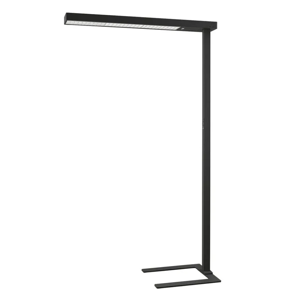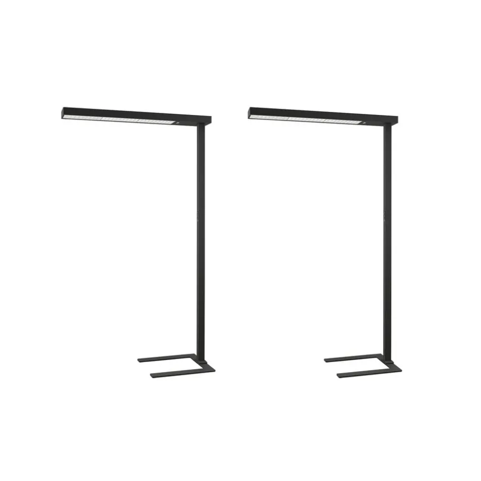 Susi LED-gulvlampe til kontor i sort med dæmper, U-fod, dagslyssensor og bevægelsessensor til optimalt arbejde ved en computerarbejdsplads, i et sæt med 2. Lyset fra Susi gulvlampe til kontor er stort set indirekte og meget behageligt med en blændfri effekt, så du kan koncentrere dig om dit pc-arbejde i lang tid, hvilket også begunstiges af det flimmerfrie lys, som lampen producerer. Lyset er universalhvidt, ideelt til arbejde ved computeren. Foden på denne LED-gulvlampe er U-formet, så den nemt kan placeres rundt om et bordben. Takket være en dagslyssensor tilpasses lysstyrken automatisk til det omgivende lys og kan også styres manuelt via en dæmper på touchpad’en, hvis det er nødvendigt. Bevægelsessensoren sørger også for, at lyset slukkes, hvis arbejdsstationen ikke har været brugt i længere tid (mere end 30 minutter). Leveres i et praktisk sæt på 2. Tekniske data: – flimmerfrit lys – U-formet fod – inkl. bevægelsessensor (rækkevidde 3,5 m, registreringsvinkel 85°) – med dagslyssensor – med dæmper – særlig høj andel af indirekte lys – til skærmarbejdspladser (UGR > 11)
