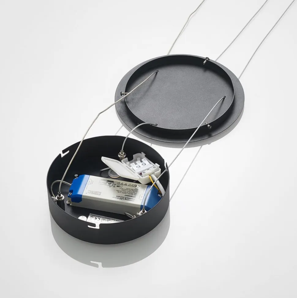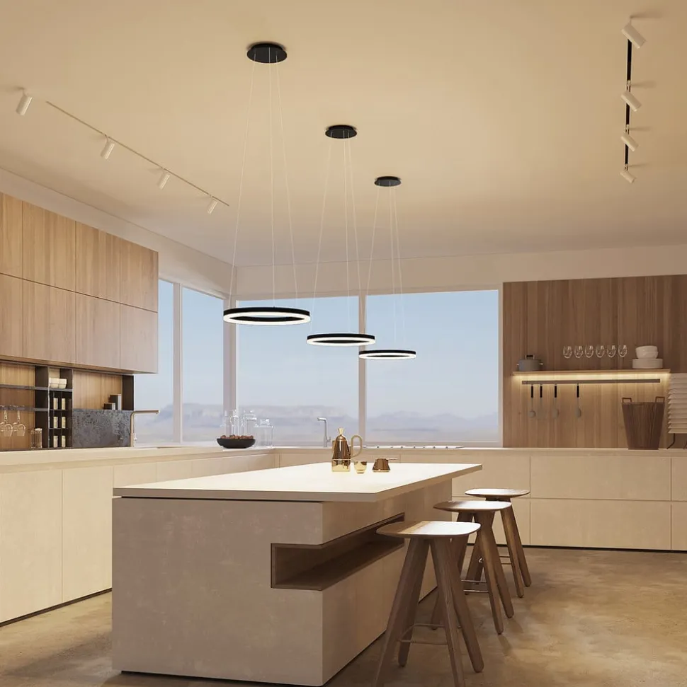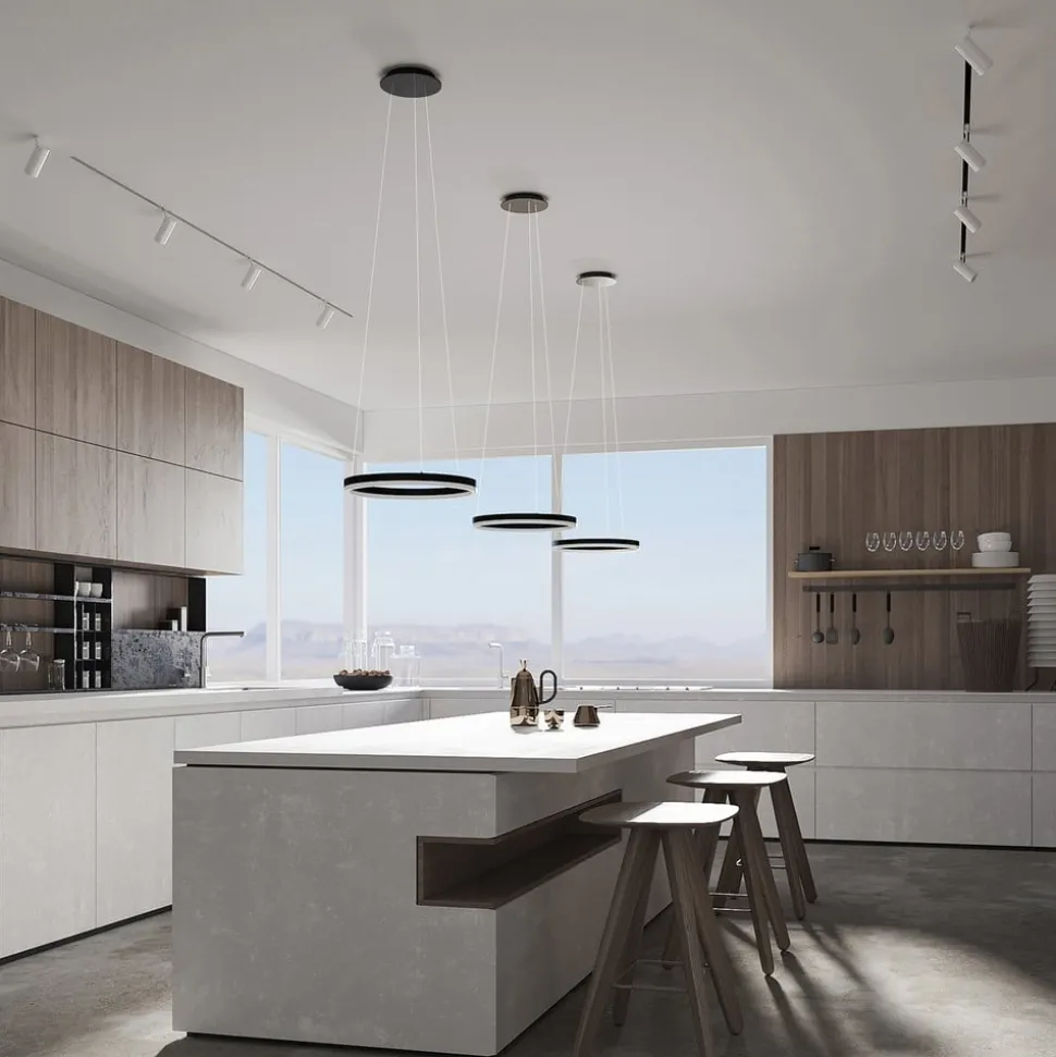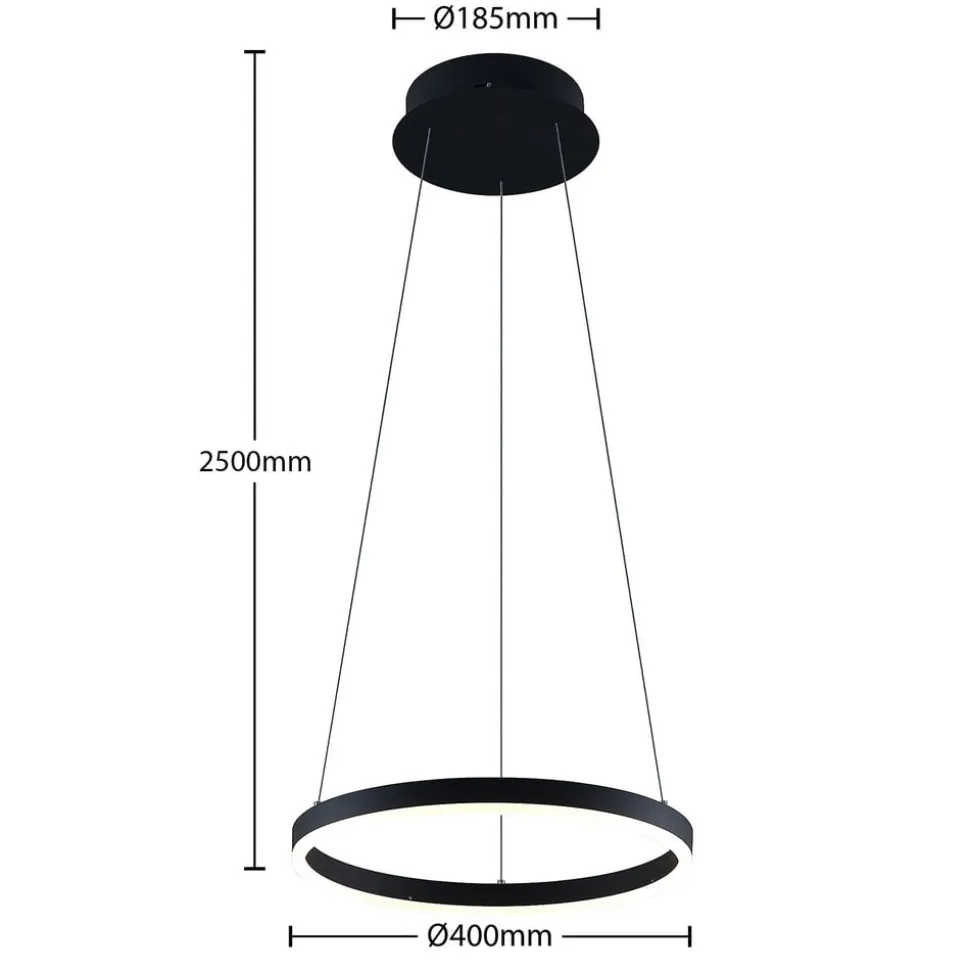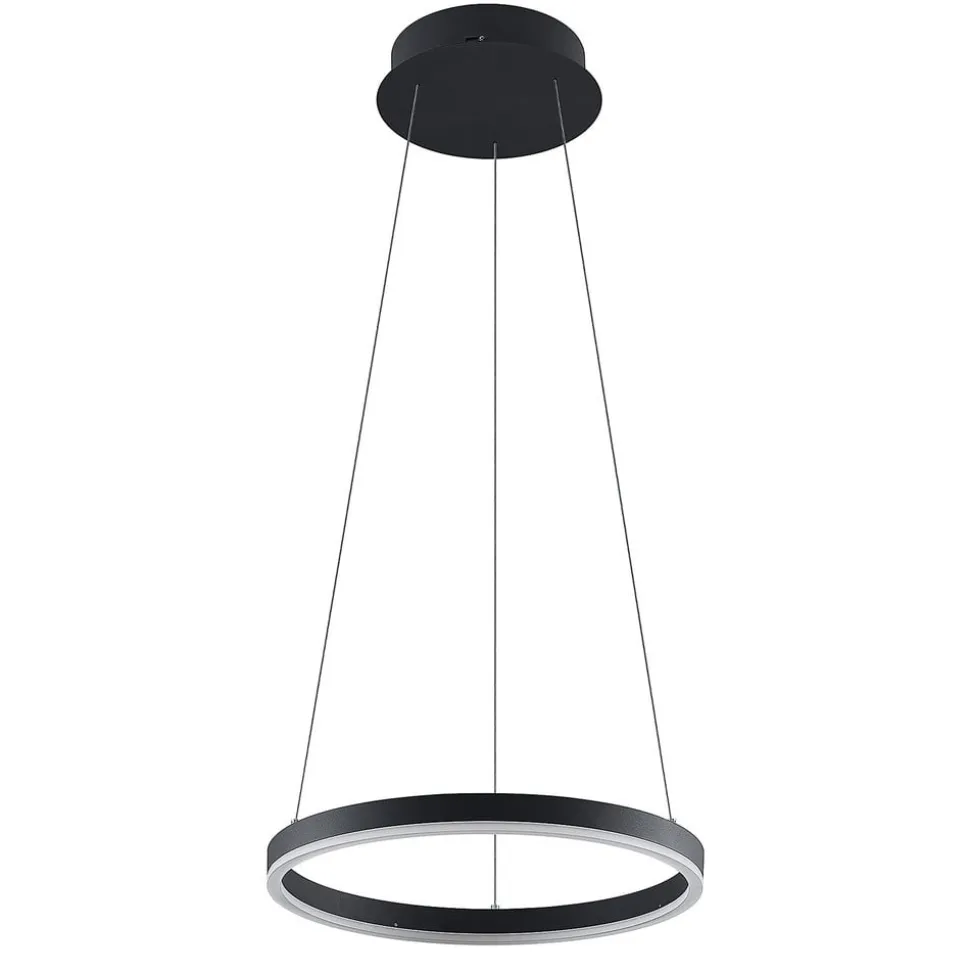 Albiona ringformet LED-pendellampe i sort – perfekt til køkkener og spisestuer Albiona er en lyskilde, der med sin moderne, minimalistiske ringform ser særligt stilfuld ud i moderne interiører. Pendellampen strækker sig ud i rummet på tre filigrane ledninger og domineres visuelt af den sorte metalring, på hvis underside de lyse, effektive LED’er er indlejret og giver et varmhvidt, hyggeligt skær. Stilfuldt design med et særligt udtryk!