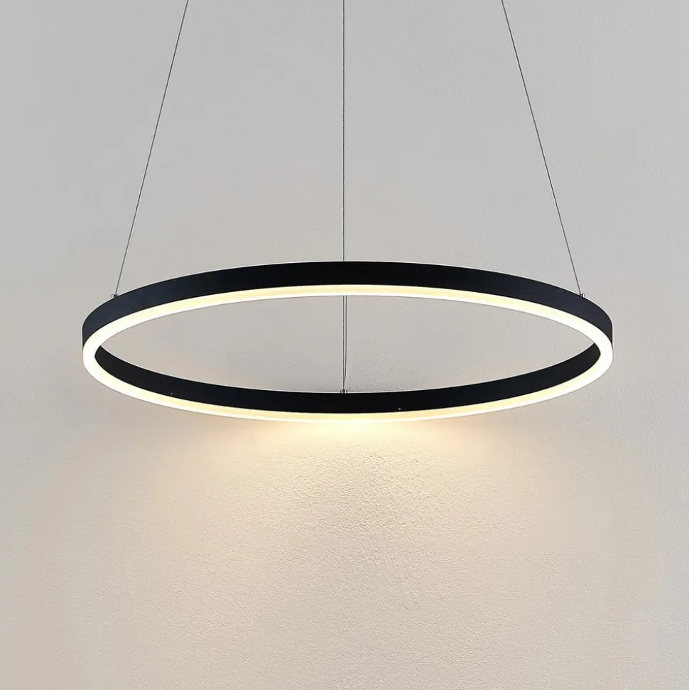 Albiona ringformet LED-pendellampe i sort – perfekt til køkkener og spisestuer Albiona er en lyskilde, der med sin moderne, minimalistiske ringform ser særligt stilfuld ud i moderne interiører. Pendellampen strækker sig ud i rummet på tre filigrane ledninger og domineres visuelt af den sorte metalring, på hvis underside de lyse, effektive LED’er er indlejret og giver et varmhvidt, hyggeligt skær. Stilfuldt design med et særligt udtryk!