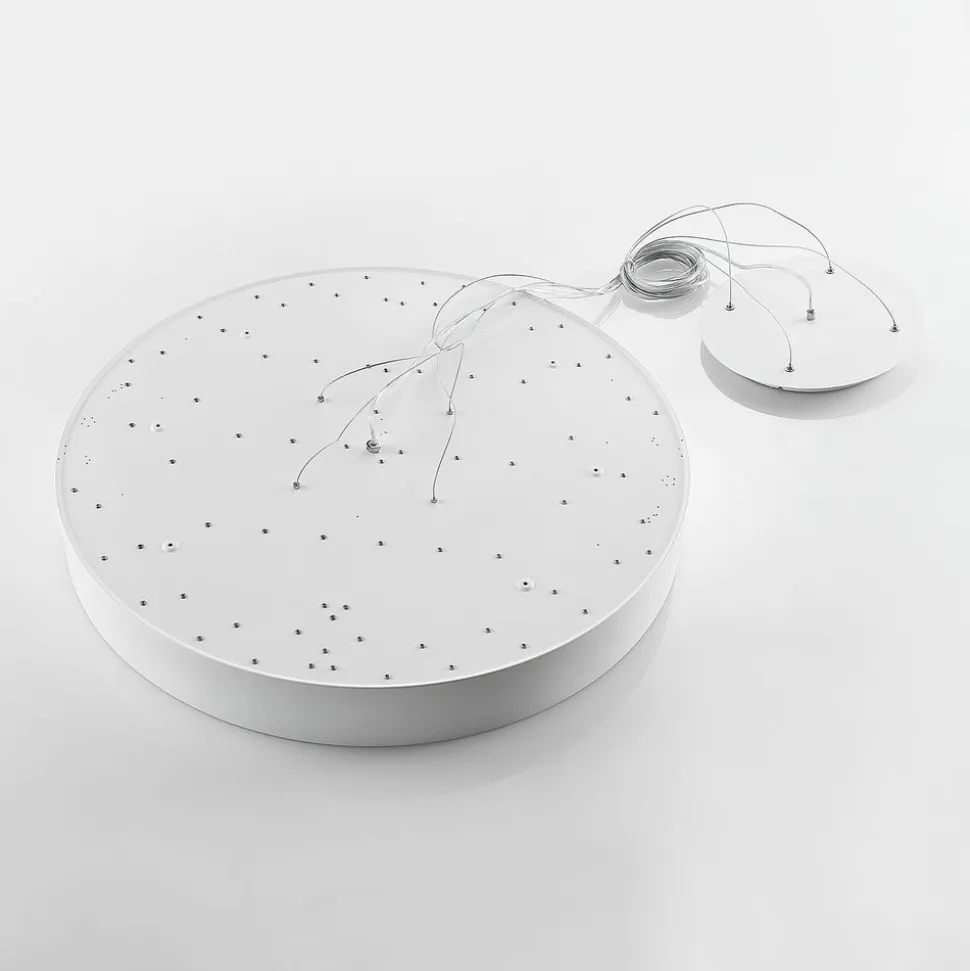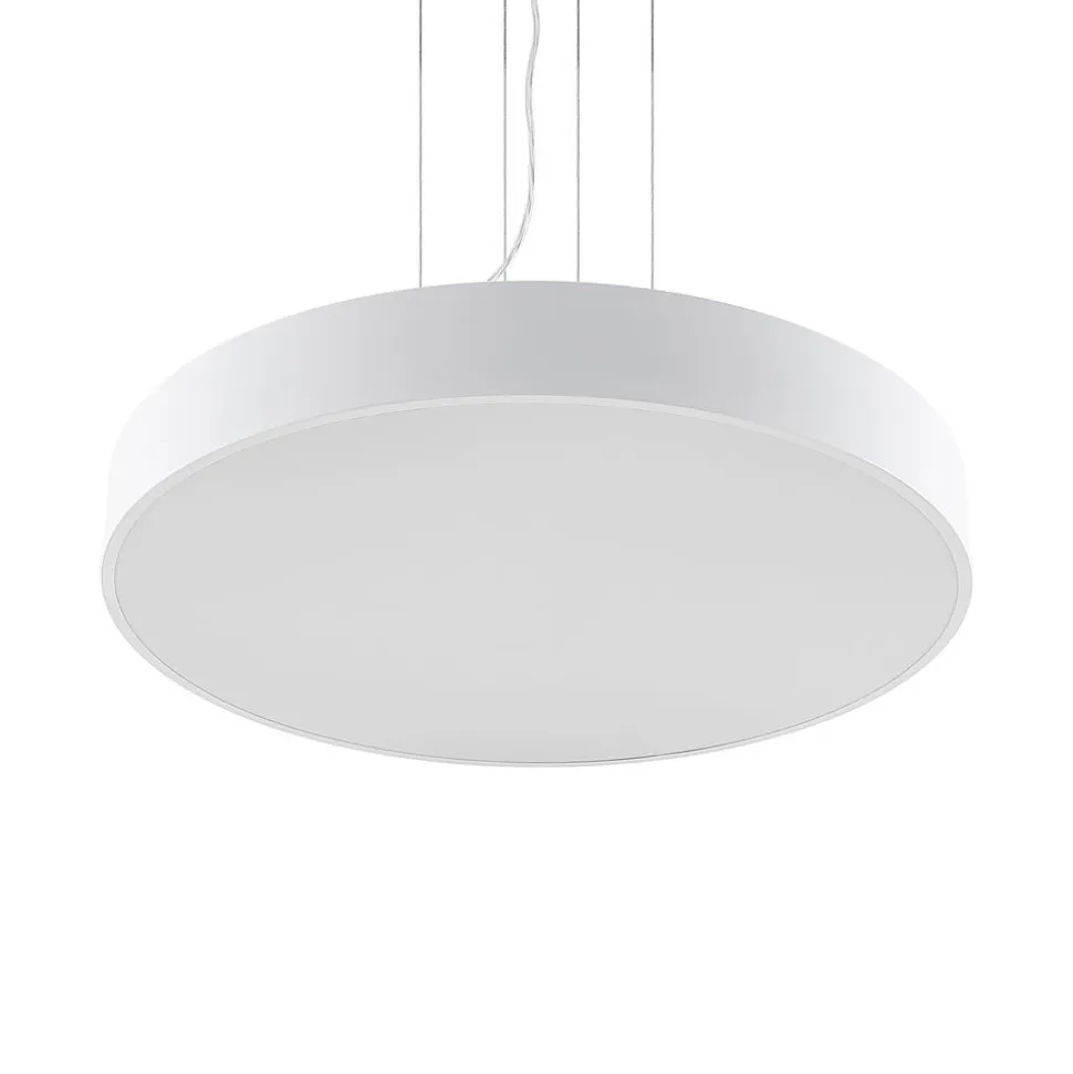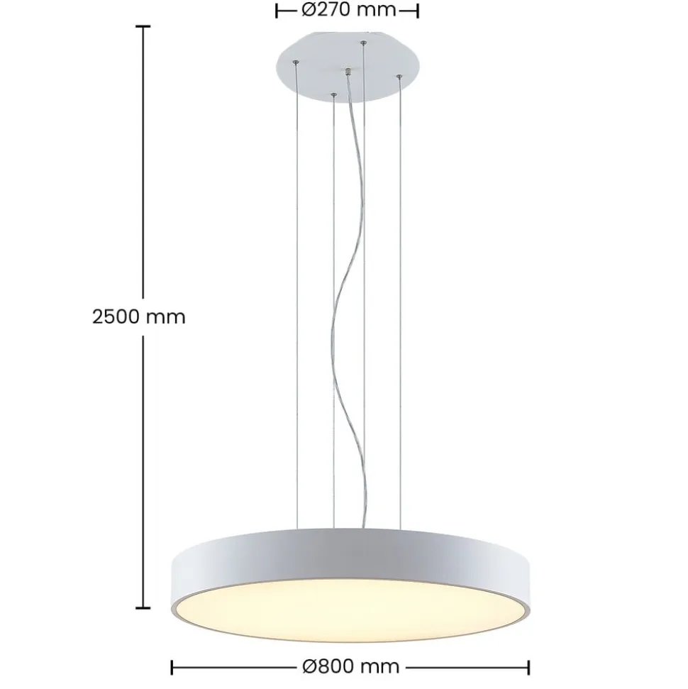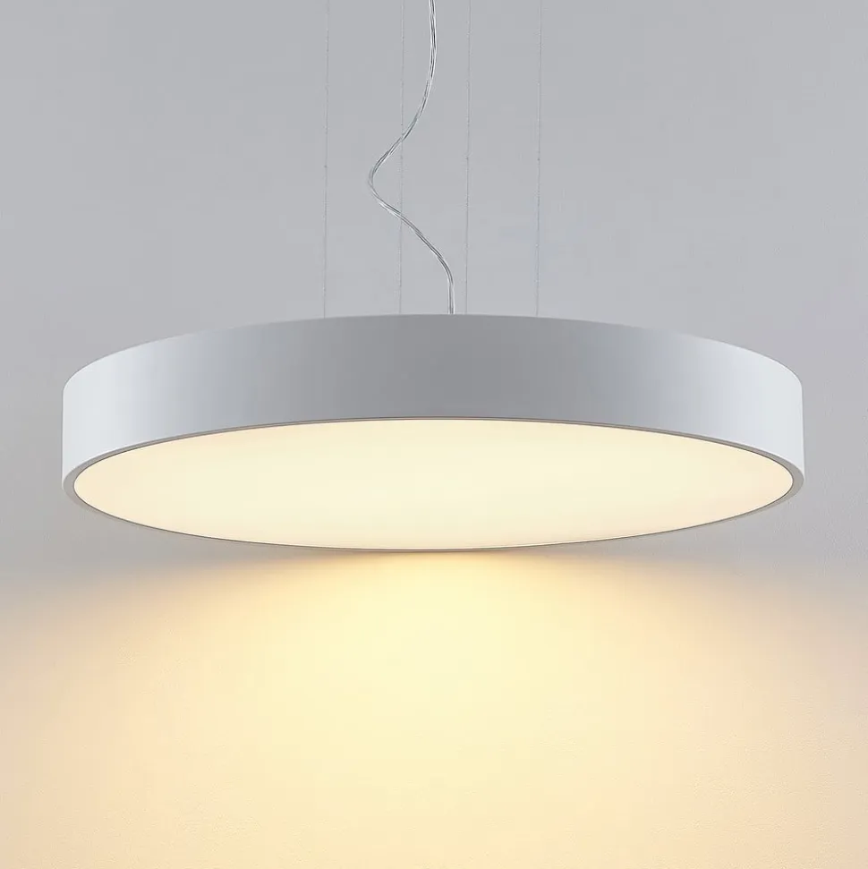 Stor, hvid Noabelle LED-hængelampe med wireophæng og DIP-kontakt til indstilling af lysfarve Noabelle er helt hvid, hvilket skaber et harmonisk look, især fordi det overordnede design er minimalistisk og moderne. Hængelampen har også meget at byde på rent teknisk med sin kraftige, energibesparende LED-teknologi, som sikrer god belysning af bolig- og erhvervsområder uden højt energiforbrug. Tværtimod er forbruget særligt lavt takket være det høje lysudbytte. En anden fordel er, at du kan vælge mellem to lysfarver via en DIP-kontakt under installationen, så den tilsigtede brug ikke bestemmes af farvetemperaturen. Du kan vælge mellem hyggeligt lys i varmhvid eller universalhvid, som er mere velegnet til arbejde. Den runde form har et enkelt udseende, men Noabelle LED-hængelampen har ret store dimensioner, så den bestemt har en vis tilstedeværelse i rummet. Det fine ophæng af tre ledninger afrunder effektivt designet og giver det en vis lethed, som også udstråles af den hvide overflade.