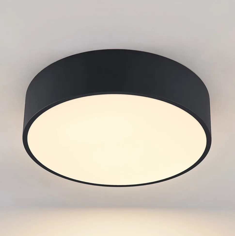 Sort LED-loftlampe Noabelle med metal surround og akryl diffusor, lysfarve justerbar på forhånd