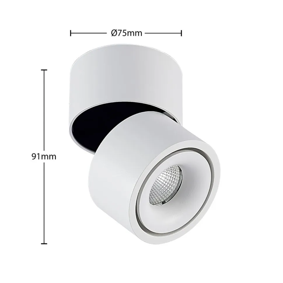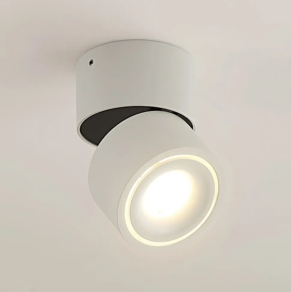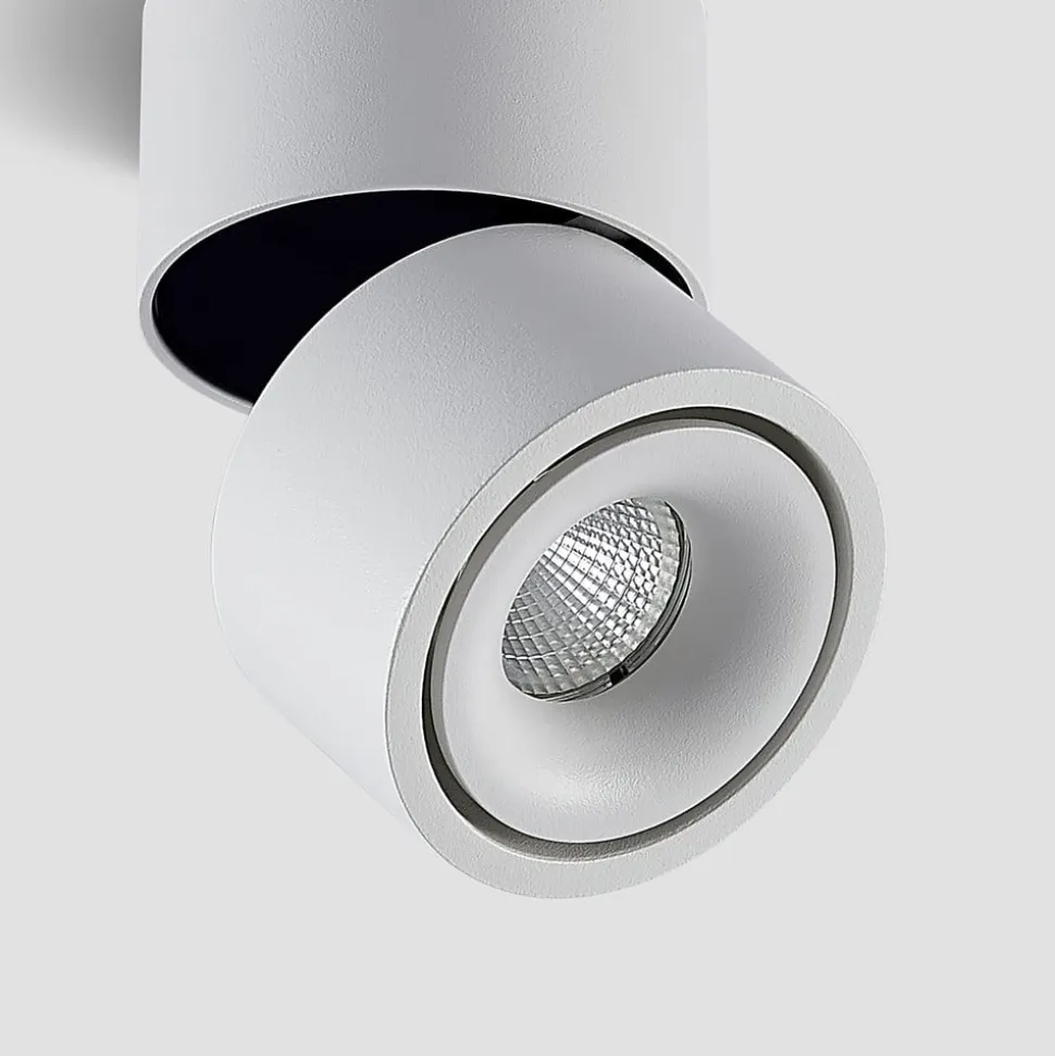 Roterende og drejelig Rotari LED-loftsspot i hvid Den lille Rotari LED-loftsspot imponerer med sit moderne design og fleksible belysningsmuligheder. Armaturhovedet kan ikke kun drejes 350°, men også svinges 90°. Aluminiumshuset er udstyret med en indbygget reflektor, der har en udstrålingsvinkel på 34° og beriger rummet med varmt hvidt lys (3.000 K). Armaturets lysstyrke kan om nødvendigt justeres ved hjælp af en forkant- eller bagkantdæmper og har en CRI-værdi > 90. Driveren er integreret i huset.