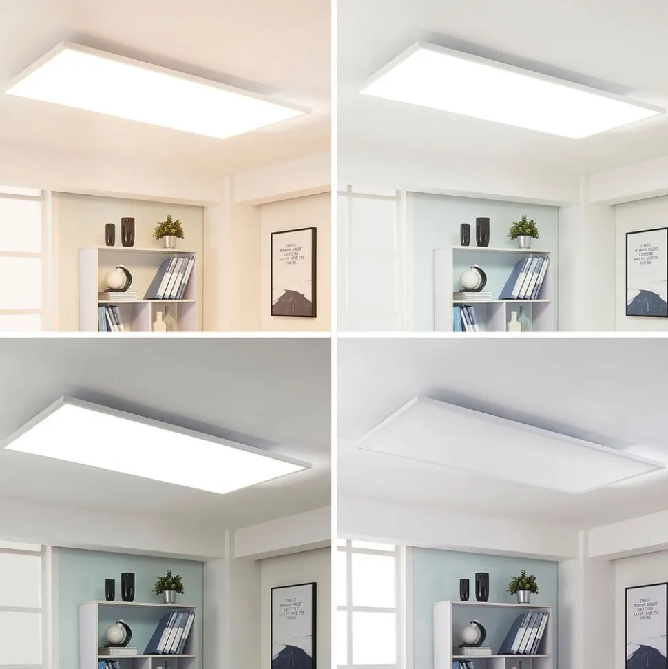 Stort, dæmpbart Arya LED-panel med fremragende lysstyrke og variabel lysfarve Arya har relativt store dimensioner og en kantet form, der giver det et funktionelt udseende. Armaturet kan bruges i private områder, men opfylder naturligvis også en god funktion i kommercielle eller offentlige områder. LED-panelet styres via en fjernbetjening, som er inkluderet i leveringsomfanget. Den kan bruges til at justere lysfarven (varmhvid/universalhvid/dagslys) samt lysstyrken. Der kan også tændes for en natlysfunktion. LED’ernes høje lysstyrke skaber en meget god grundlysstyrke – med skrueløs lynkobling af høj kvalitet (holdbar, sikker og værktøjsfri fjedermekanisme)