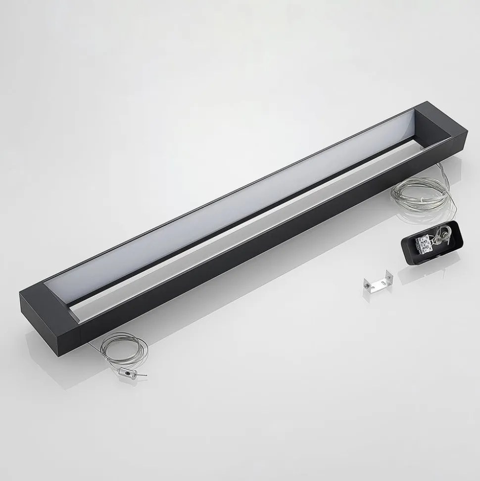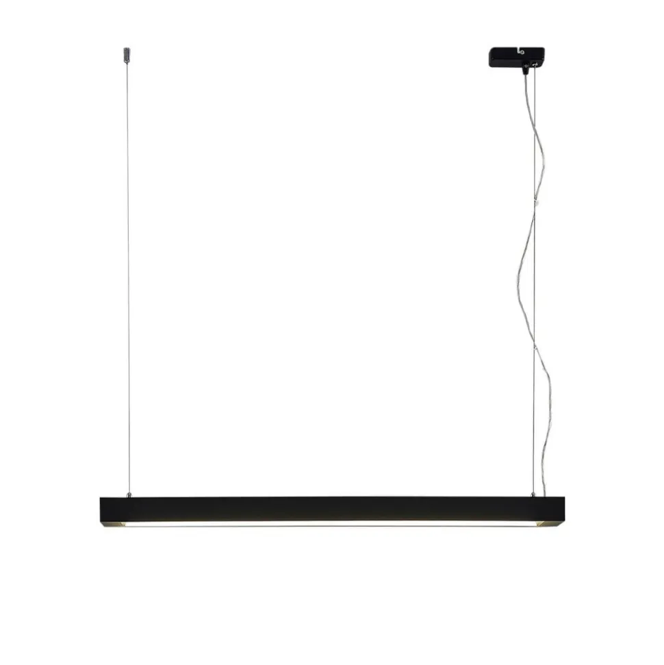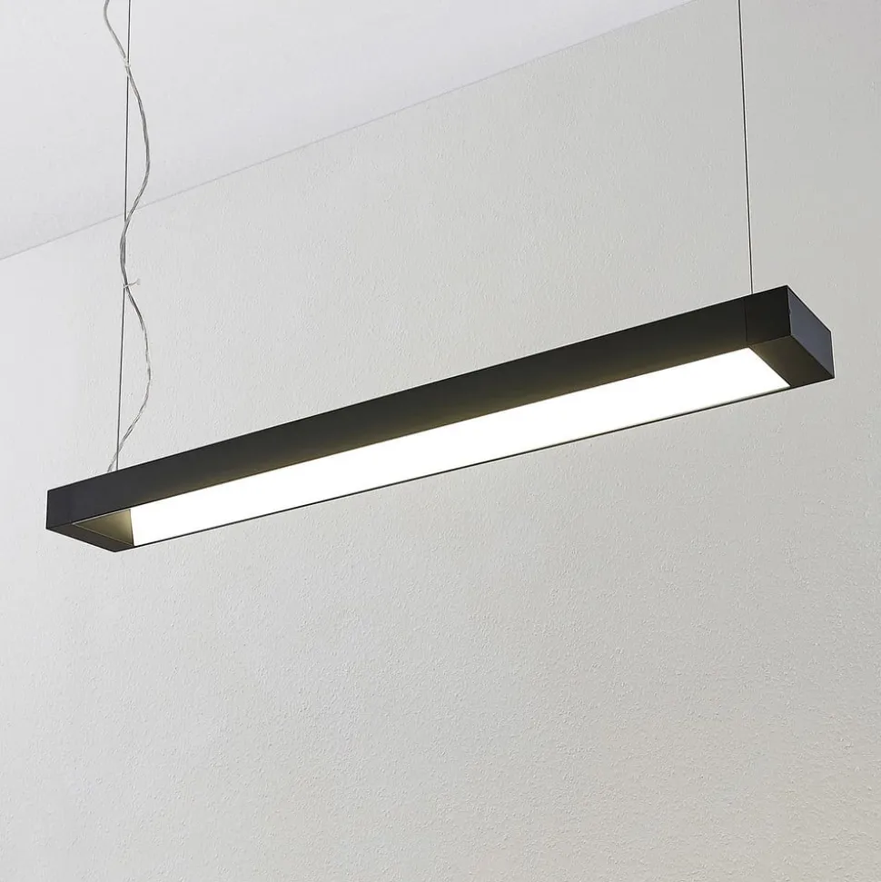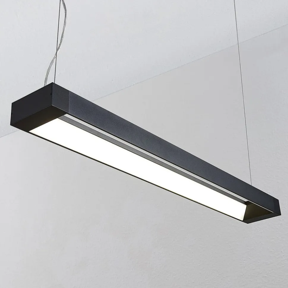 Cuna LED-kontorpendellampe i rektangulær form og med sort overflade Denne pendellampe med kraftigt lysende, energieffektive LED’er er ideel til at oplyse et område. Det universalhvide lys giver dig mulighed for at koncentrere dig om dit arbejde i lange perioder. Skærmens ramme har en kantet form og er lavet af aluminium med en sort overflade, der ser meget tidløs ud. Lysets strålevinkel er 120°. Tekniske data: – Strålevinkel 120° – Universalhvidt lys – Slagfasthedsklasse IK03 – SDCM < 5 – Mulighed for gennemfortrådning