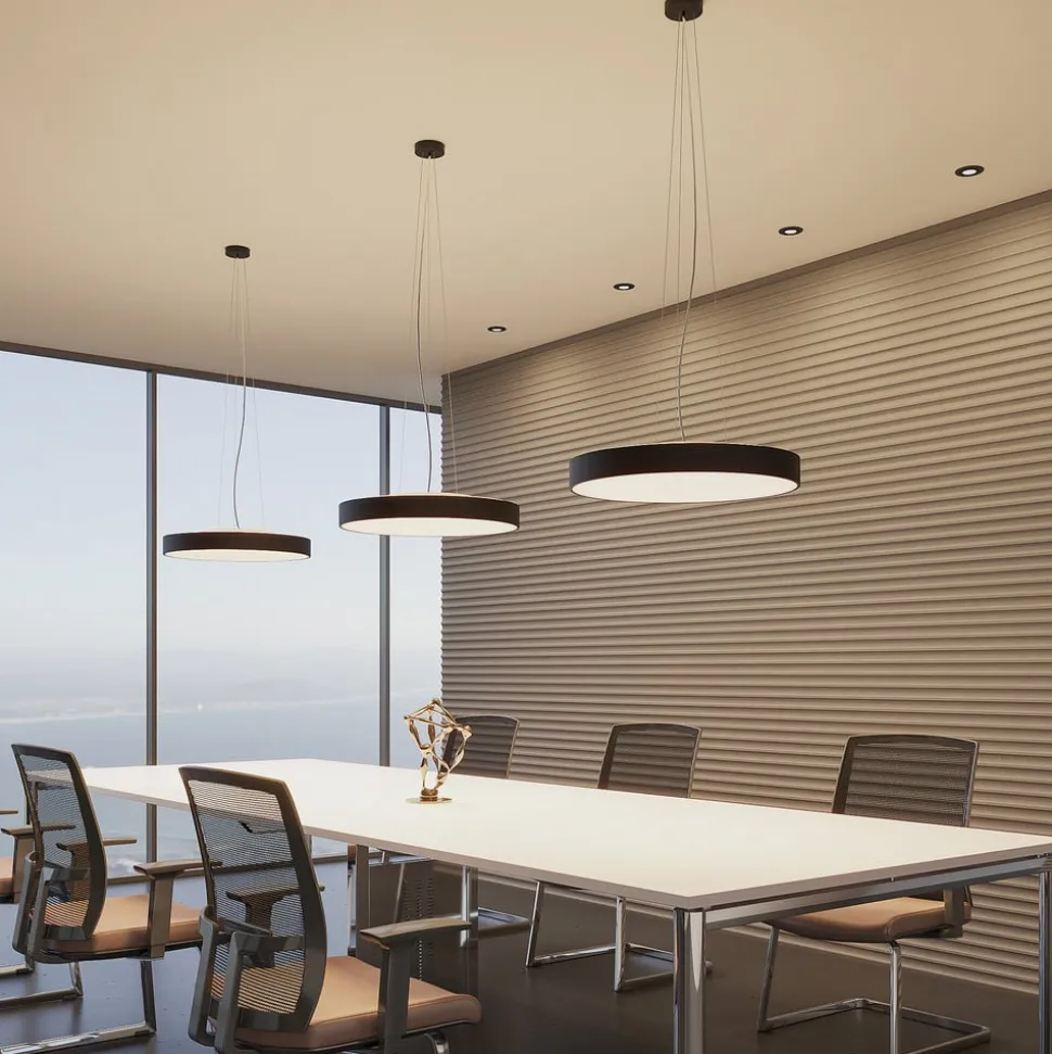 Sort LED-pendellampe Vanida i rund form Rammen på Vanida-pendellampen er ligesom loftbeslaget lavet af sorttonet aluminium, hvilket skaber et udtryk af kølig elegance. Skærmen suppleres af en diffusorplade af hvid akryl, som spreder lyset blødere og mere jævnt, hvilket forstærker armaturets hyggelige look. Lyset skinner ikke kun nedad, en lille mængde slipper også opad, så lyset spotlightes ind i rummet som allround-lys, hvilket skaber en mere naturlig effekt. Takket være LED-teknologien garanterer pendellampen et stærkt lys med et relativt lavt forbrug, hvilket er i tråd med moderne ideer. Stålkabelophænget fuldender det moderne look på en passende måde og giver Vanida et udtryk af behagelig lethed.