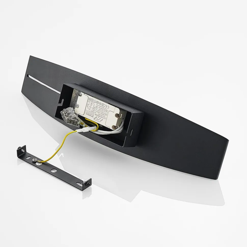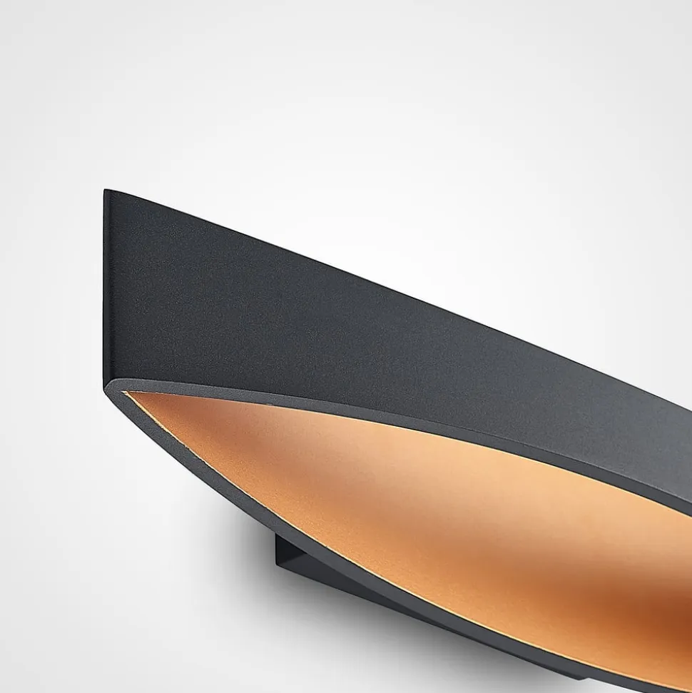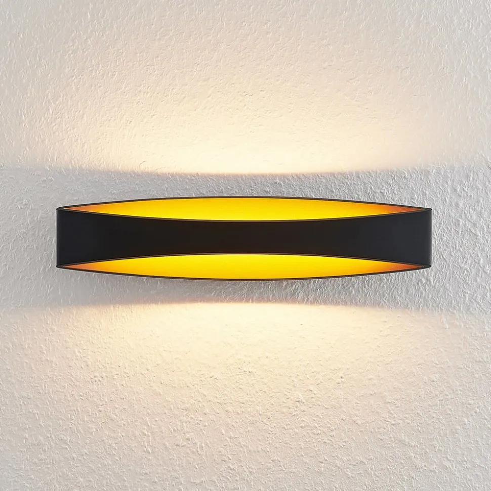 Sort og guld LED-væglampe Jelle med en interessant form Denne væglampe passer meget godt ind i moderne interiører med sit afrundede design, som er en kombination af konvekse og konkave former. Frontpanelet har en konveks form, mens det bageste element har en konkav form, så det forbliver tydeligt synligt og visuelt skaber en kombination af sort og guldindretning. Denne farvekombination anses for at være meget effektiv og svarer til en harmonisk kontrast, som har været meget på mode i nogen tid nu. Designet muliggør også en helt blændfri belysning, og LED’erne spotlighter smukt den gyldne overflade, som derefter reflekterer lyset på en varm og hyggelig måde. Sidst, men ikke mindst, skal det nævnes, at LED-teknologien er langtidsholdbar og også scorer med førsteklasses effektivitet, hvilket betyder, at stærkt lys kombineres med lavt strømforbrug. En væglampe af denne type passer perfekt i alle slags opholdsrum, men især godt i passager som korridorer eller klassisk i et soveværelse eller en stilfuld stue.