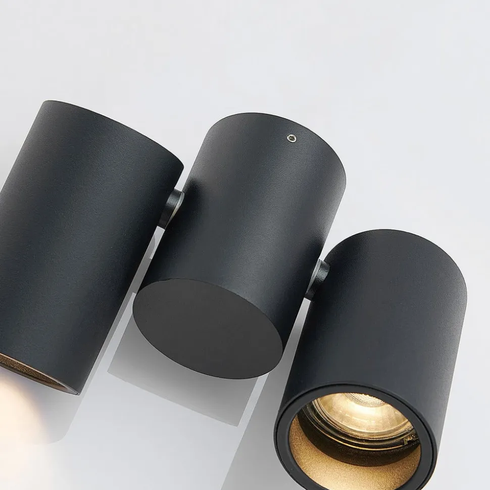 Gesina 2 lyskilder LED-spotlight med sort overflade og drejelige skærme LED-loftlampen Gesina har tre cylindriske elementer, hvoraf to er skærmene, og det midterste er loftbeslaget. Da hvert lampehoved kan drejes, kan lysmønstret justeres efter behov for at belyse de ønskede områder i rummet. Den sorte finish har et diskret udseende og passer godt til moderne boligstile. Lampen kan bruges i et køkken, en gang eller et opholdsrum.