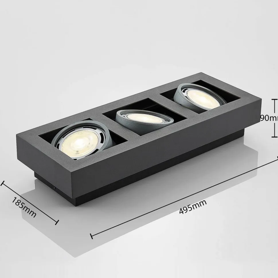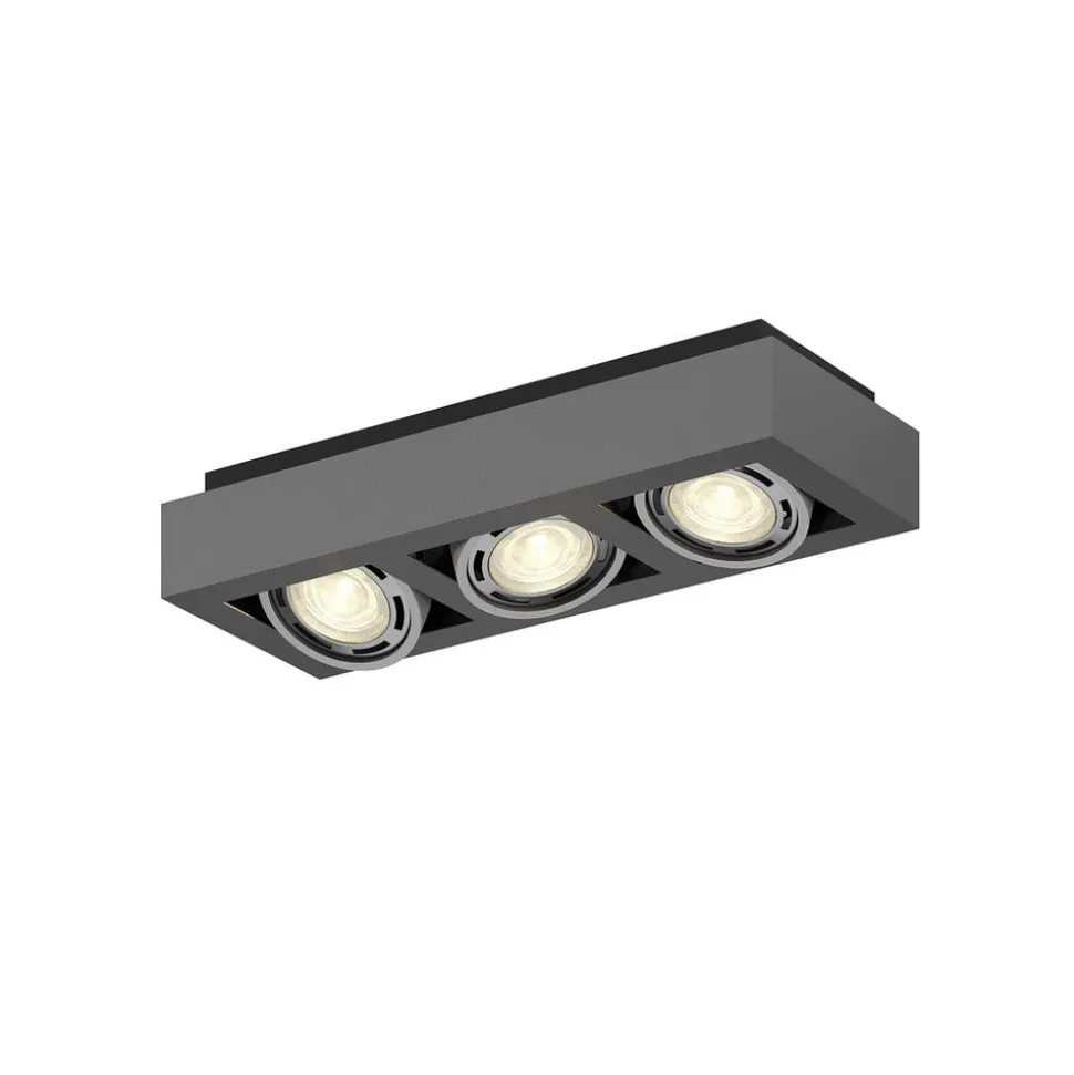 Mørkegrå Ronka loftlampe til tre dæmpbare LED-loftlamper Ronka er velegnet til både private ejendomme og erhvervslokaler og er en loftlampe, der skaber et klart lys og kan bruges godt som hovedbelysning. De tre indsatser i det mørkegrå, kantede hus kan nemt drejes, hvilket betyder, at lysmønstret bedre kan justeres. Passende GU10-lysstofrør kan købes separat via tilbehøret. Den skrueløse tilslutningsklemme er meget nyttig til tilslutning, så kablerne kan tilsluttes hurtigt, sikkert og uden brug af værktøj. Loftspottens design er både moderne og diskret og er frem for alt funktionelt. Lampen kan derfor nemt kombineres med forskellige stilarter – til GU10-pærer med ES111-design (maks. 20 W)