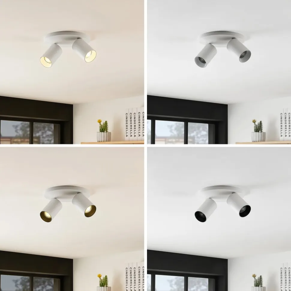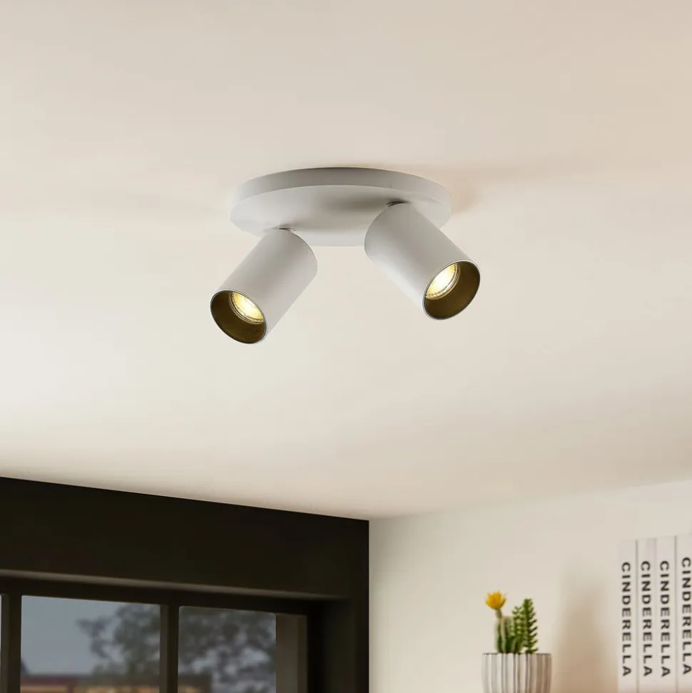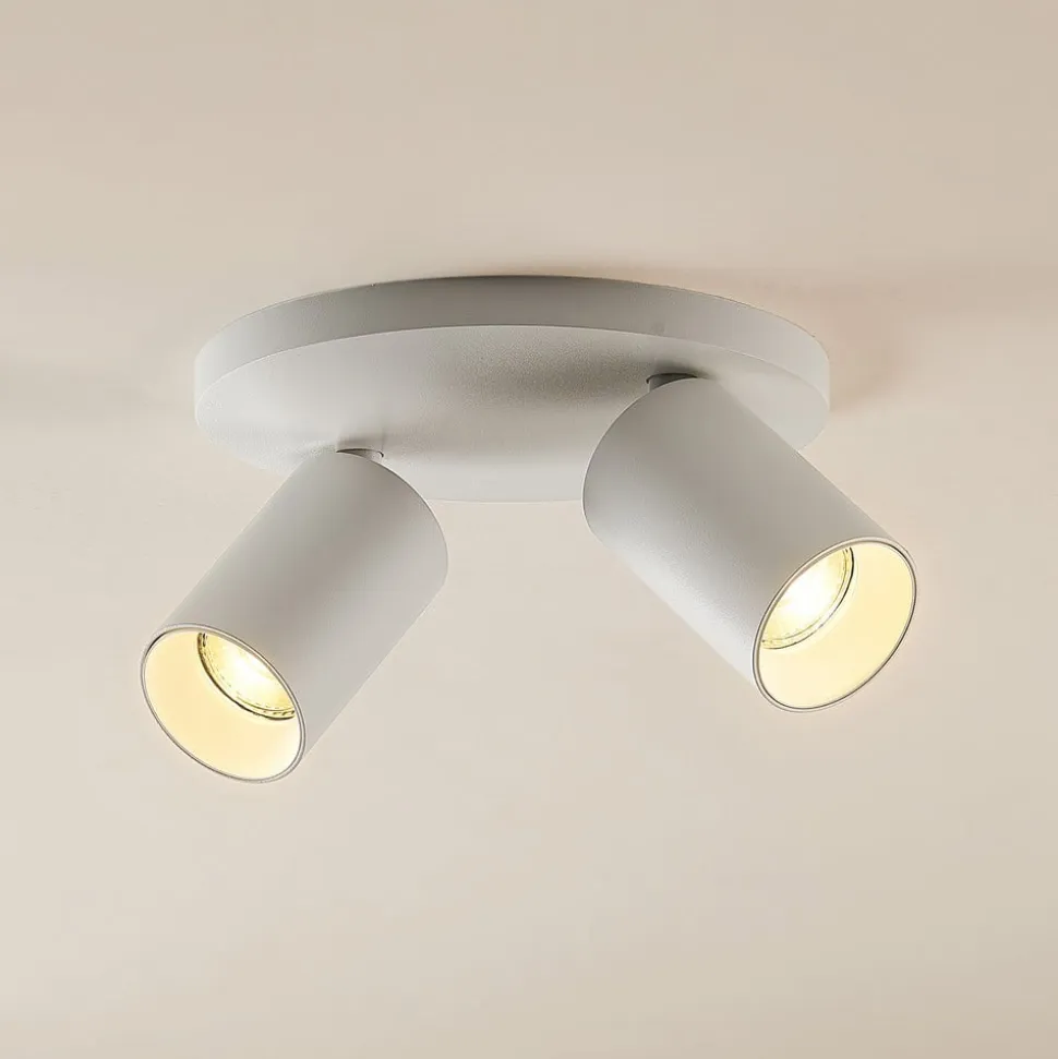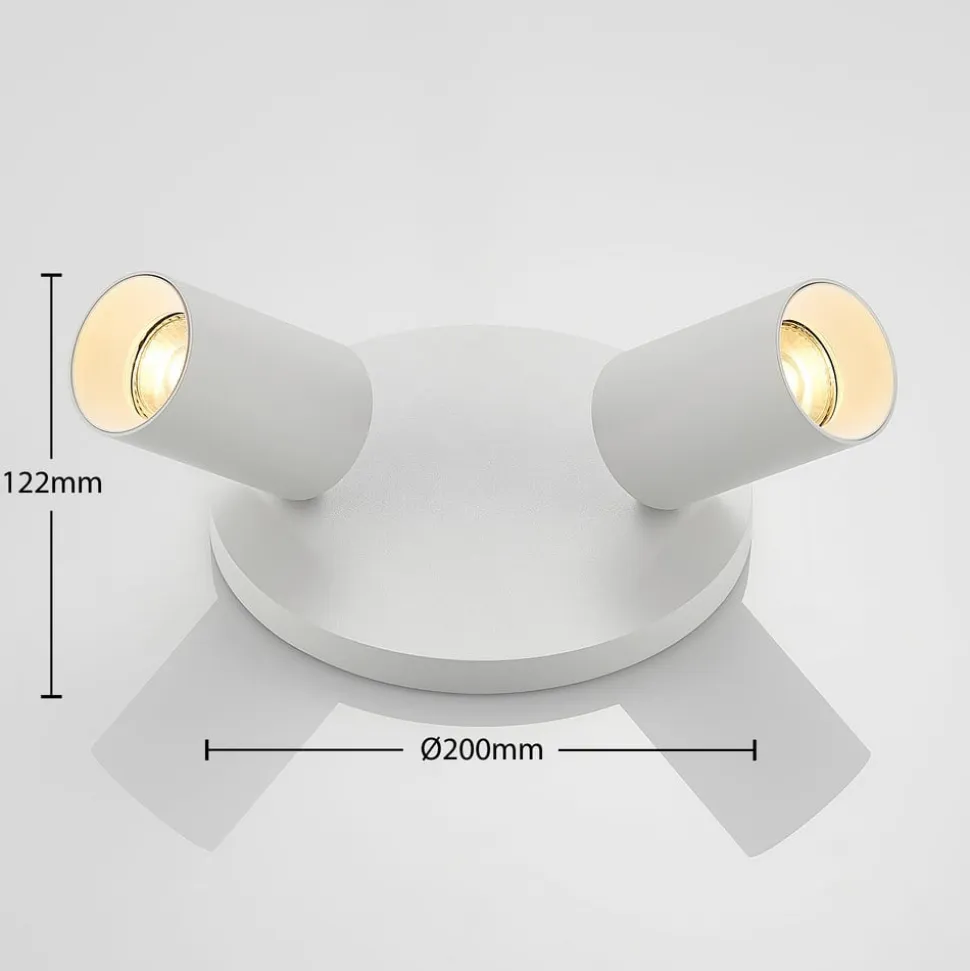 Denne smukke indendørslampe har et lyst og enkelt design. To cylindriske lampekroppe, der lyser i forskellige retninger, er monteret på den runde, flade loftbeslag. Både spotterne og loftbeslaget er fremstillet af robust aluminium og belagt med en hvid finish.