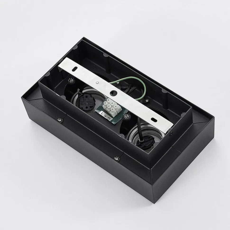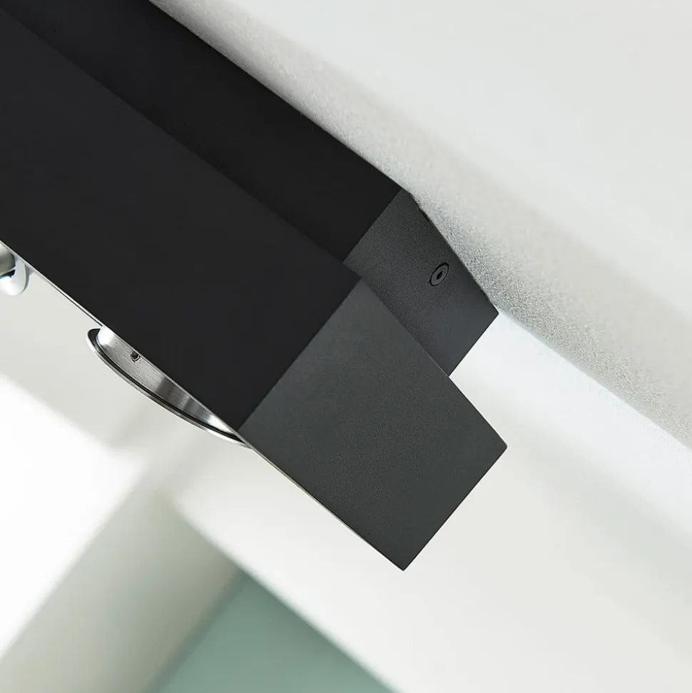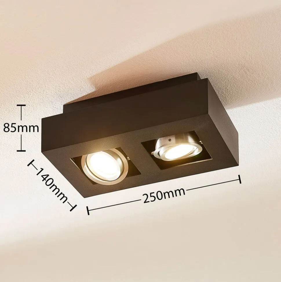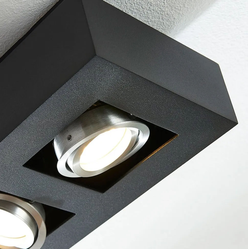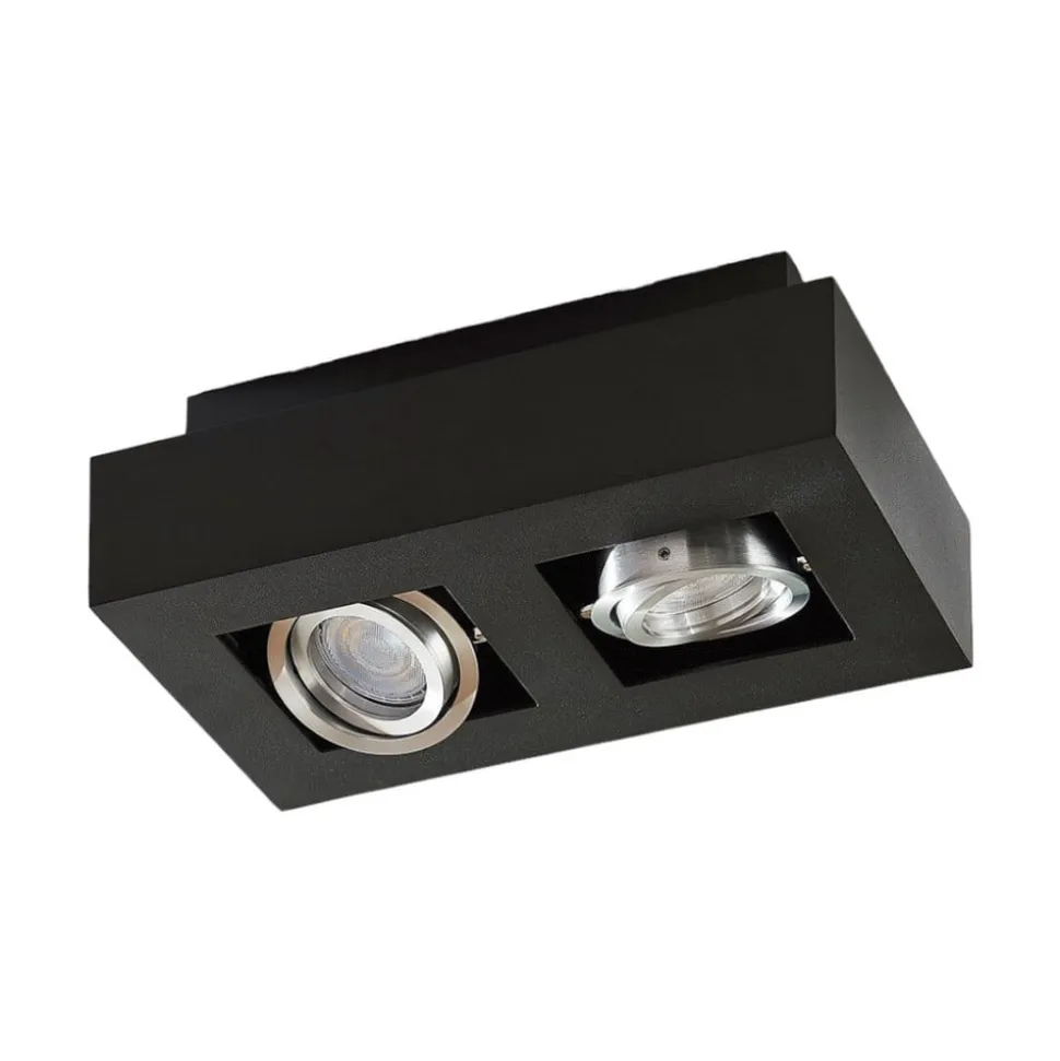 Sort Vince loftlampe med 2 GU10-fatninger Denne 2 lyskilder loftlampe har et metalhus med en mat sort finish og to lyskildeindsatser til GU10 LED-pærer. Begge indsatser kan drejes efter behov, hvilket gør det nemt at justere lysretningen. Den sorte overflade kan kombineres med mange miljøer, mens loftlampens design har et teknisk touch, der appellerer i private eller kommercielle omgivelser – med skrueløs klemme til hurtig tilslutning til loftet