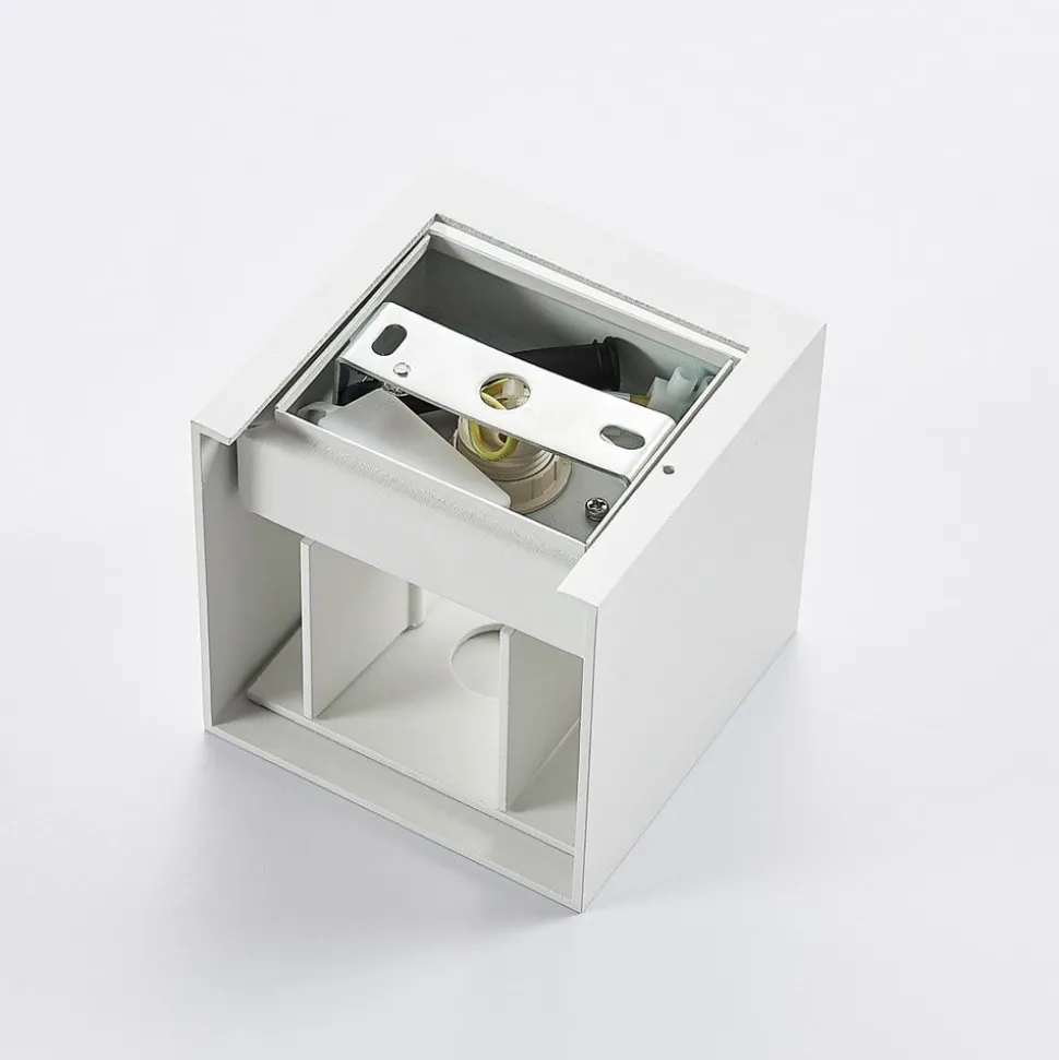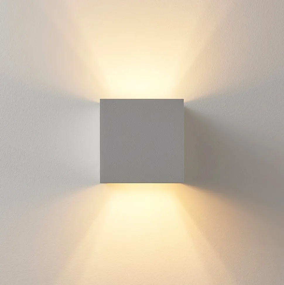 Hvid, kantet væglampe Zuzana med justerbar lysvinkel i et sæt med 2 Zuzana består af en kubeformet aluminiumskrop og har en enkel hvid finish, der er meget tidløs og kan kombineres med mange møbler. Man skal også være særlig opmærksom på lyseffekten, som selvfølgelig kun kan ses, når lyset er tændt. Afhængigt af indstillingen sendes lyset så opad og nedad i en lige stor vinkel eller består af en smal lysstråle og en bredere lysstråle, hvorved dette kan realiseres i toppen eller bunden – væglampen leveres i et praktisk sæt med to