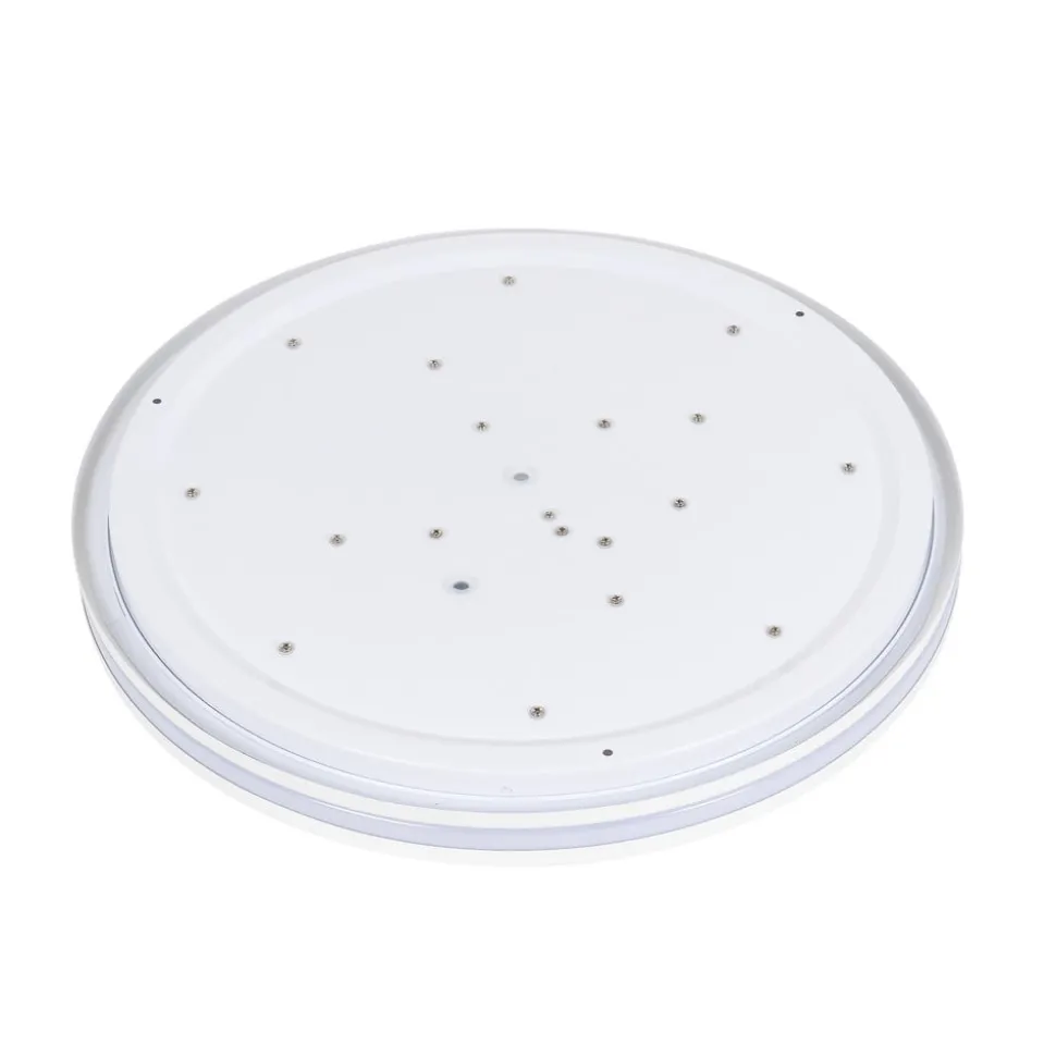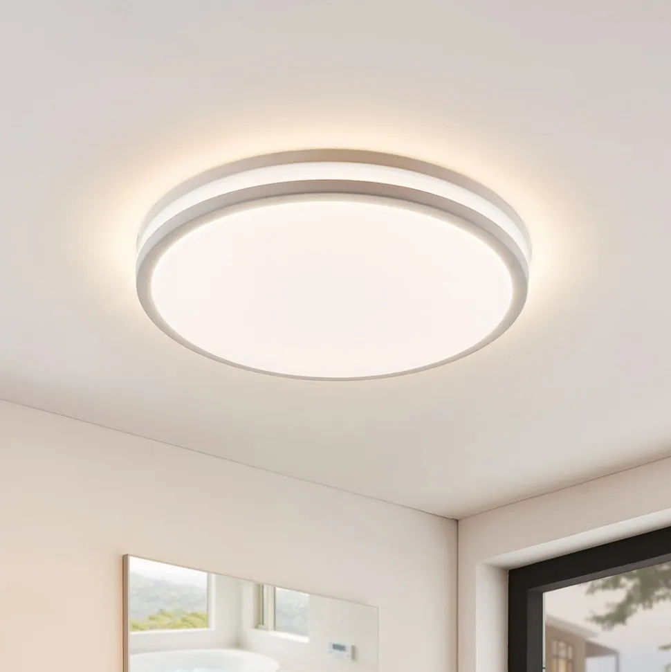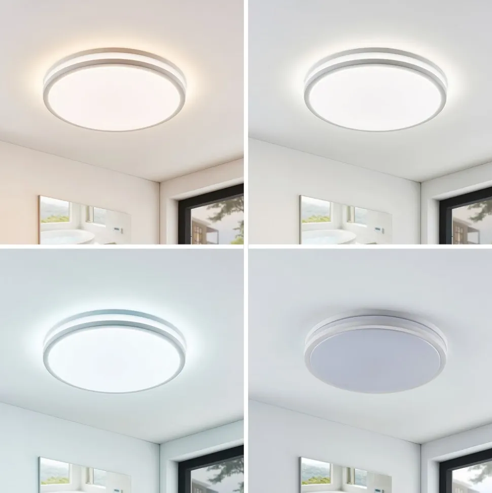 Arnim rund LED-loftlampe med fjernbetjening, IP44, dæmpbar og skiftende lysfarve Arnim LED-loftlampen med kapslingsgrad IP44 er designet til brug i badeværelser og andre fugtige rum. Med sine mange funktioner kan den også bruges i kommercielle miljøer, hvor den til enhver tid giver et tilpasset lys. Justeringsmulighederne omfatter både lysfarve og lysstyrke, og der medfølger en fjernbetjening til at ændre disse funktioner. Den kan bruges til at variere lysintensiteten i 22 niveauer eller trinløst, og det samme gælder lysfarven, som kan justeres i 20 niveauer eller trinløst fra varmhvid til dagslysets lyse farve. Derudover kan LED-loftlampen styres i fire niveauer via vægkontakten: – fuld lysstyrke, 3.000 K – fuld lysstyrke, 4.500 K – fuld lysstyrke, 6.000 K – natlysfunktion med 10 procent lysstyrke, 3.000 K Der er en hukommelseseffekt for begge styringsmuligheder, så når man først har foretaget et valg, bevares det, næste gang man tænder for det.