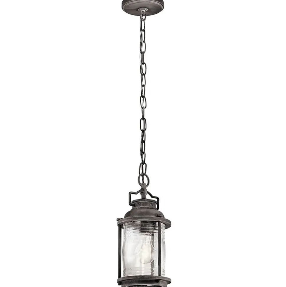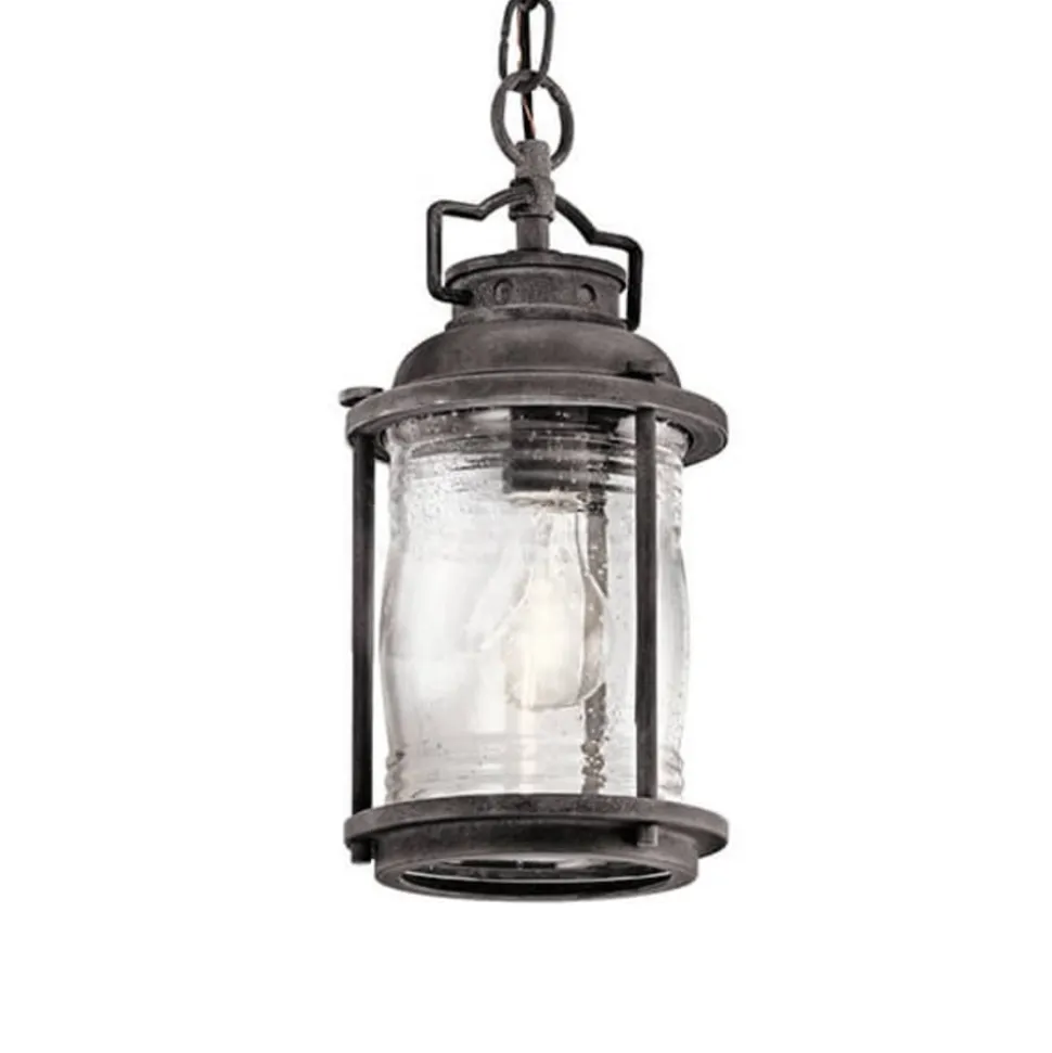 Med Ashland Bay-hængelampen, som pryder enhver ejendom med sit smukke nostalgiske design, er der atmosfærisk belysning, f.eks. B. den overdækkede terrasse, ikke for kort. Det kan også give den nødvendige lysstyrke under et tagudhæng, for eksempel i indgangsområdet. Den rustikke kædeophæng og zinkfinish kompletterer det tiltalende design. Glasskærmen er klar og afslører lyskilden, hvorfor en dekorativ glødelampe (kan bestilles via tilbehør) skal være den foretrukne lyskilde.