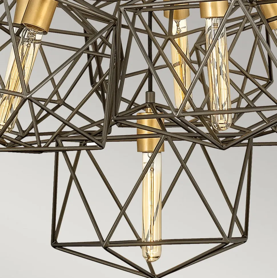 Bronzefarvet lysekrone Astrid med accenter i guld – 11-flamme Skærmen på den elleveflammede lysekrone Astrid præsenterer sig som en luftig geometrisk skønhed. Skærmen fascinerer i en mat bronzetone, og guldfarvede accenter giver endnu mere æstetik. Denne effektive lysekrone ser smukkest ud, når der bruges matchende rørformede lamper. Pærerne er ikke inkluderet i leveringen, men kan bestilles separat via tilbehør – eksternt dæmpbar