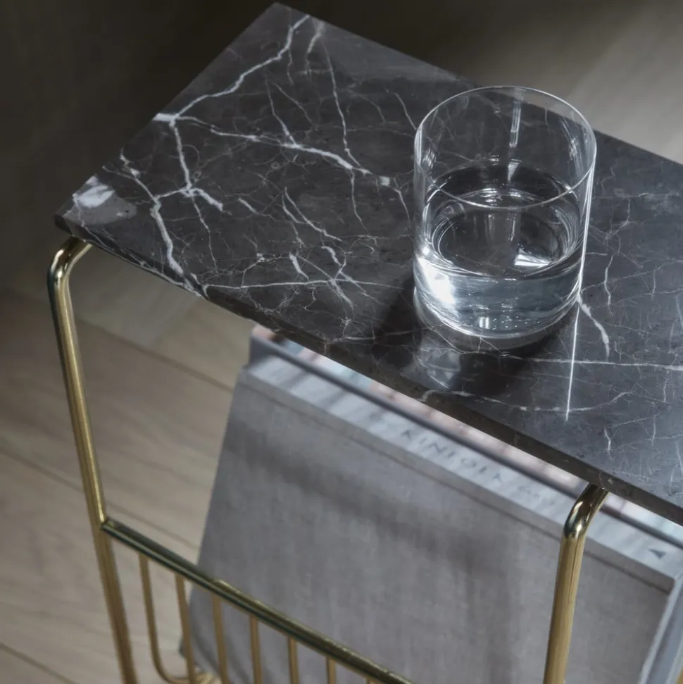 Sino magasinholder i marmor og stål Med Sino magasinholder får du også et lille, stilfuldt sidebord, som er perfekt til at stå ved siden af sofaen med en kop kaffe eller andet godt og tage en kort pause. Den integrerede magasinholder betyder, at du altid har dine yndlingsbøger og -magasiner lige ved hånden, mens stålrammen afrundes af en bordplade i marmor. Resultatet er den elegante allrounder Sino. produktinformation: Fremstillet af 100 % marmor og stål med gummifødder. Maksimal belastningskapacitet 5 kg. plejeinstruktioner: For at fjerne snavs og støv skal du tørre emnet af med en fugtig klud. Marmor tåler ikke syrer eller sure rengøringsmidler som f.eks. eddike. Sørg for at tørre sure og normale væsker, der spildes på overfladen, af med det samme for at undgå pletter.