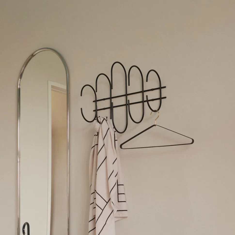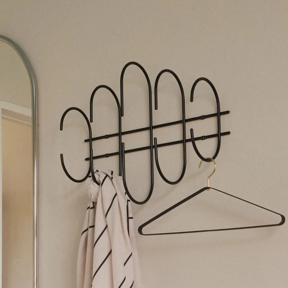 Moveo vægknagerække i stål Moveo betyder bevægelse, og det er præcis, hvad denne vægknagerække er – en tilføjelse af bevægelse til ellers rolige rum. Moveo handler om dynamik og bevægelse, hvilket giver genstanden meget mere end dens praktiske brug som knagerække. Moveo-vægknagerækken ligner små bølger, der ruller og bevæger sig langs væggen og giver rummet en rolig, men sofistikeret personlighed. Den er lavet udelukkende af stål og kan holde op til 25 kg. produktinformation: Fremstillet af 100 % stål. Maks. Maks. belastningskapacitet 25 kg. Inkl. monteringsmateriale. plejeanvisninger: Brug en fugtig klud med lunkent vand og et mildt rengøringsmiddel til at fjerne snavs og støv. Tør om nødvendigt emnet af med en blød, tør klud. Undgå at ridse med en skureklud, da det kan beskadige overfladen.