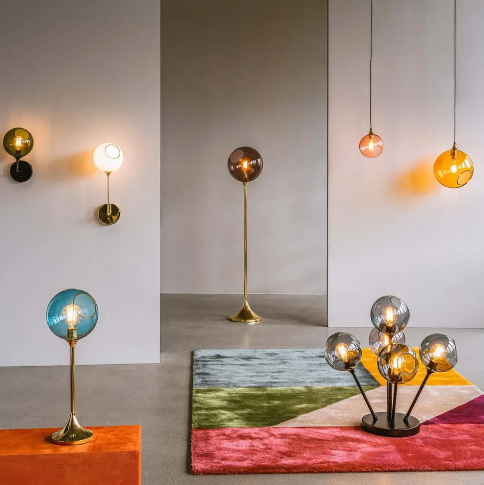Integreret lysdæmper: Ballroom gulvlampe med mundblæst glasskærm Den kunstfærdigt designede Ballroom gulvlampe fra DESIGN BY US er et velkomment highlight overalt. Basen er lavet af monokromt malet jern. Herpå troner den kugleformede skærm af mundblæst, håndmalet glas. En E27-pære (medfølger ikke, se tilbehør) passer ind i skærmen. En mat hvid pære anbefales også til den hvide version, mens en pære med synlige glødetråde bør vælges til alle andre farvevarianter, da pæren kan ses gennem glasskærmen. Du bør altid vælge en dæmpbar lyskilde, da det er muligt at regulere lysets intensitet ved hjælp af kontakten, der er integreret i stikket. Ballroom-gulvlampen er altid et elegant designobjekt, selv når lyset ikke er tændt. Bemærk: Hver håndblæst glaslampe er unik. Inklusioner i glasset (bobler) på op til 0,5 cm i størrelse er mulige.