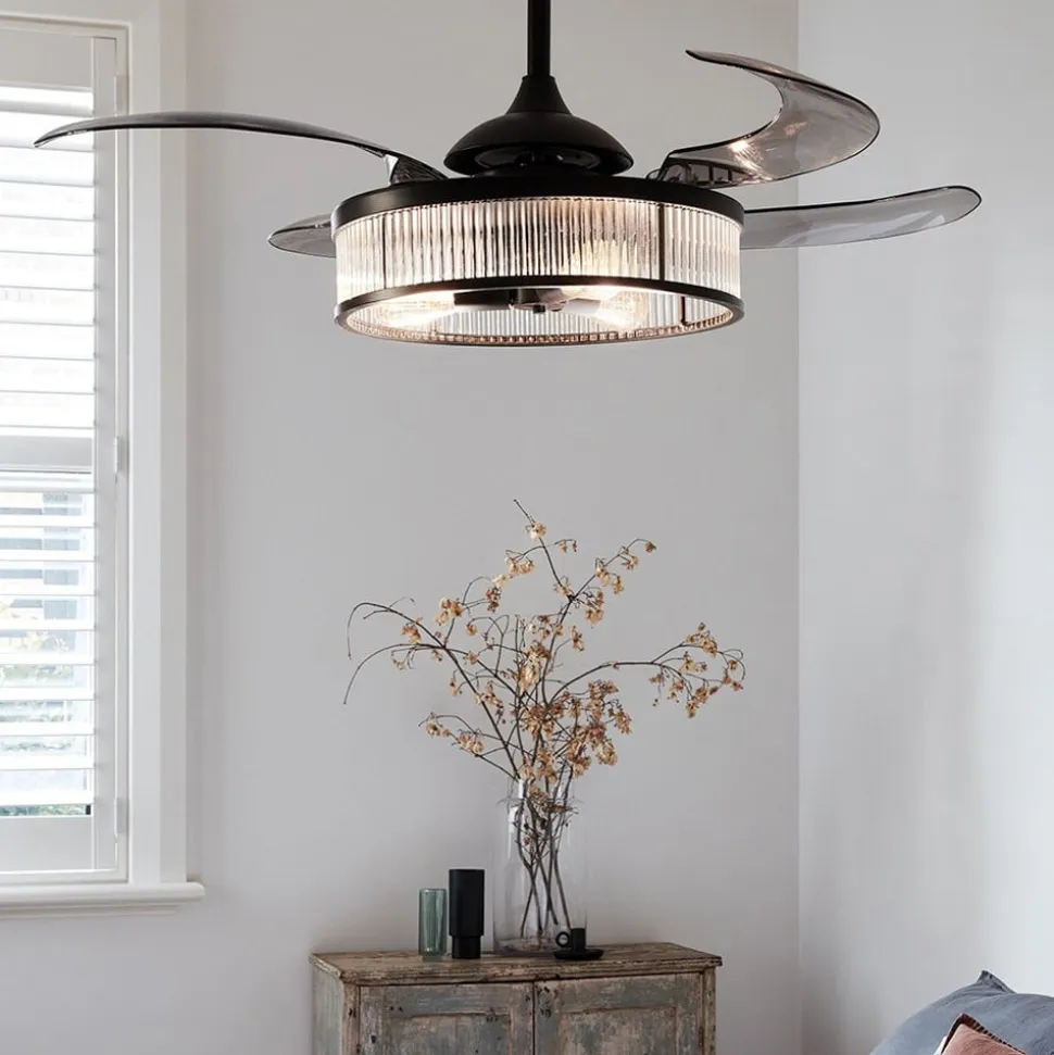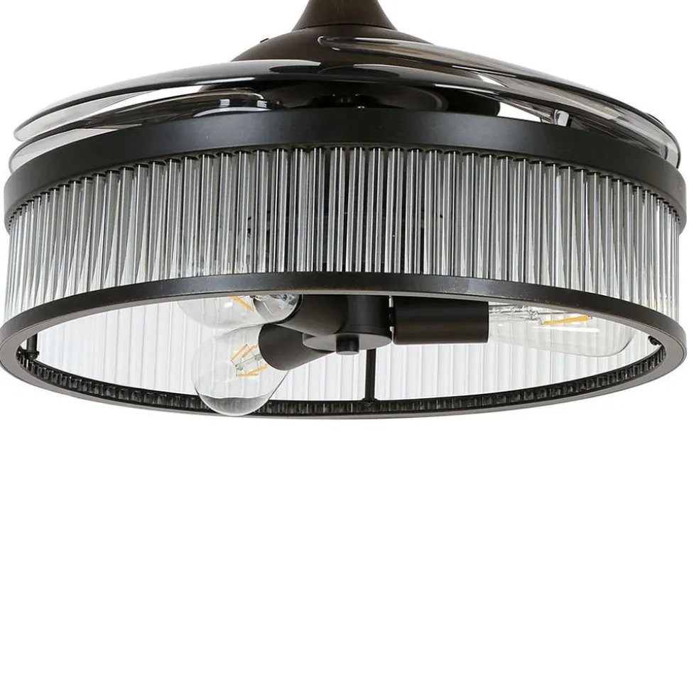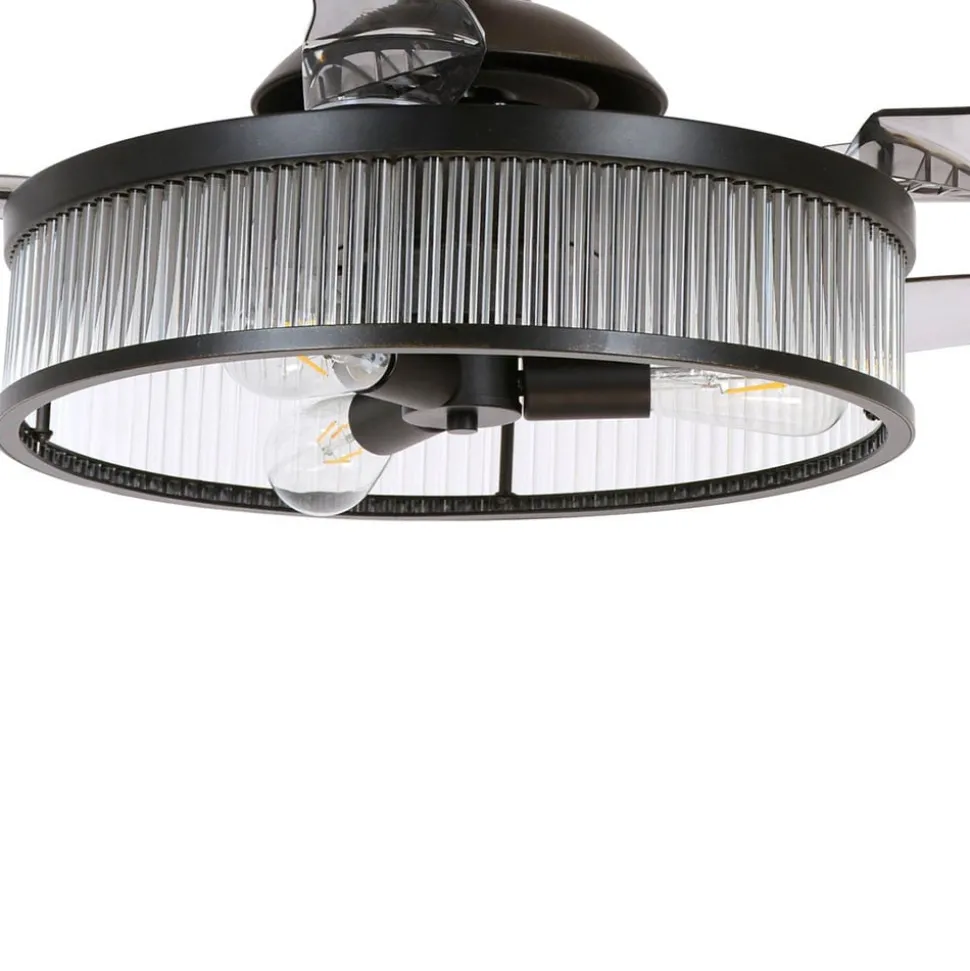 Fjernbetjent loftsventilator med fire vinger Fanaway Corbelle – kan også bruges som loftslampe Fanaway Corbelle kan bruges som mere end bare en ventilator; takket være en foldemekanisme på vingerne kan de trækkes ind. Hvis det er nødvendigt, efterlader det en ren loftslampe med tre attraktive ST64 rustikke lamper i glødetrådslook. Funktioner Hastigheden kan reguleres i tre trin afhængigt af den ønskede luftcirkulation. Mens Fanaway Corbelle giver en behagelig brise om sommeren, kan rotationsretningen også indstilles til vintertilstand. Den varme rumluft under loftet omfordeles således nedad, hvilket sparer varmeomkostninger. Fanaway Corbelle styres ved hjælp af fjernbetjeningen, der er inkluderet i leveringsomfanget. Tekniske data – Hastighed: 130/175/230 o/min – Ventilatoreffekt ved maksimal hastighed: 60 W – Luftcirkulation: maks. 180 m³/min – Velegnet til 3 x E27-pærer, maks. 25 W pr. stk