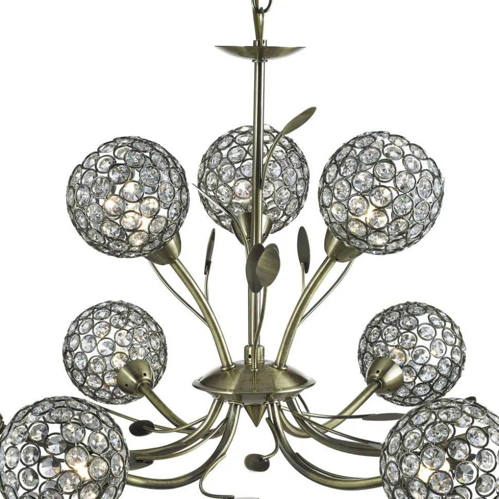 Bellis II lysekrone, antik messingfarvet, glas, 9 lyskilder, G9