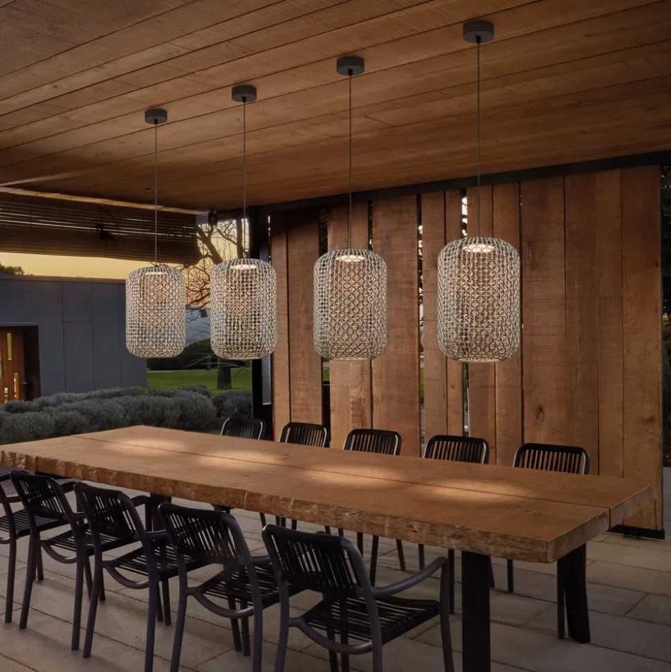 Designer udendørs pendel Nans A med vævet skærmDesignfirmaet Bover, der har base i Barcelona, legemliggør middelhavsstilen med sine Made in Spain-produkter. Pendellampen Nans er designet til udendørs brug, men kan også bruges indendørs. Den cylindriske skærm er vævet af en syntetisk fiber, hvor forskellige farvede tråde er vævet ind i hinanden. Pendlen er triac-dæmpbar, lysdæmperen er ikke inkluderet.