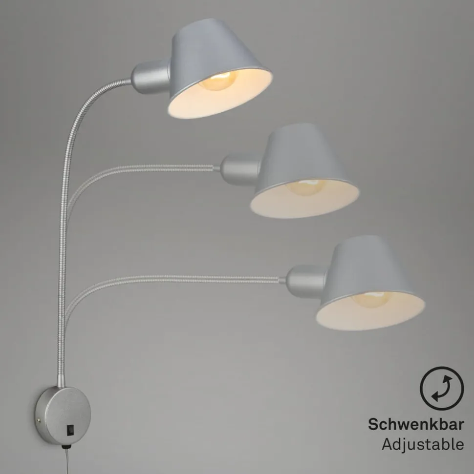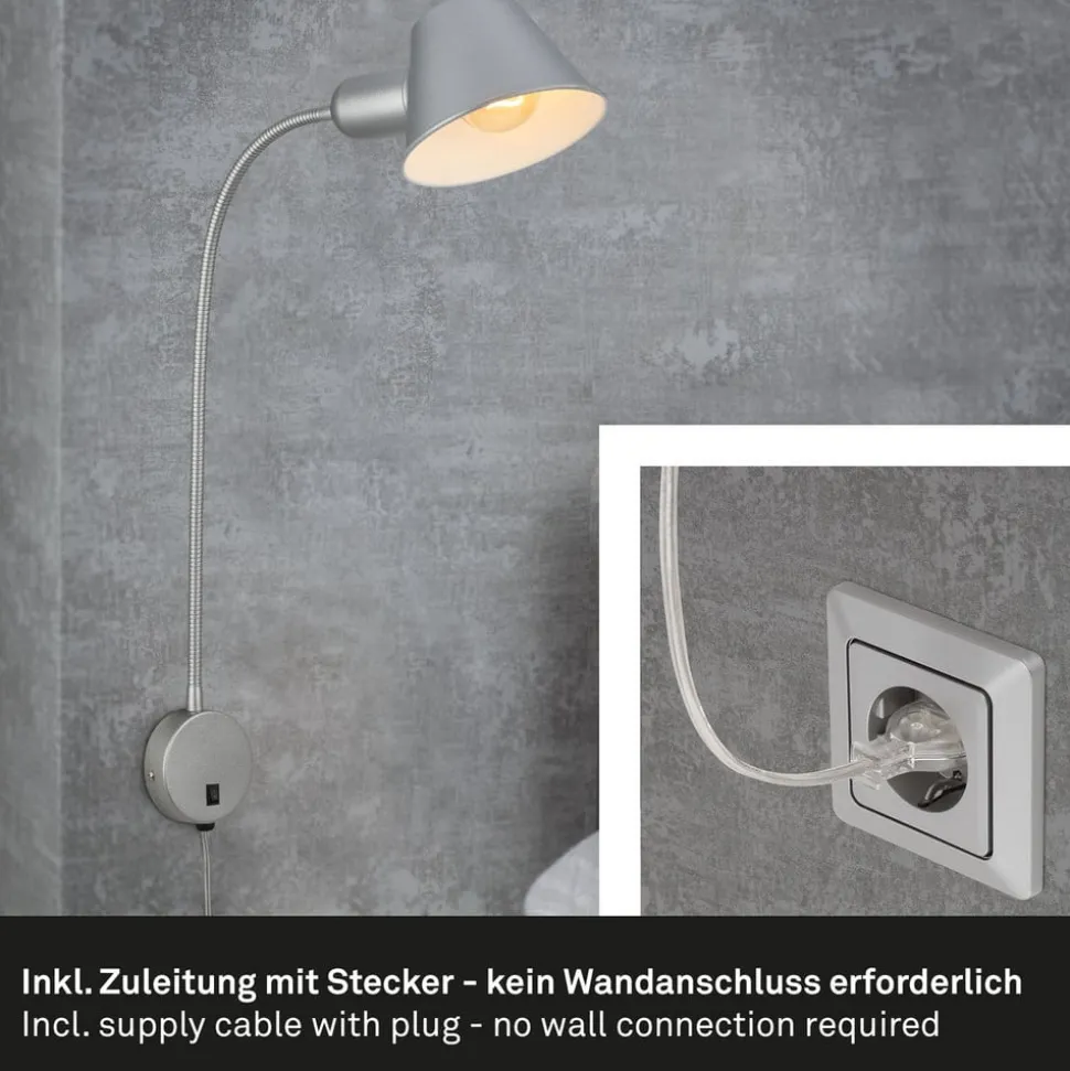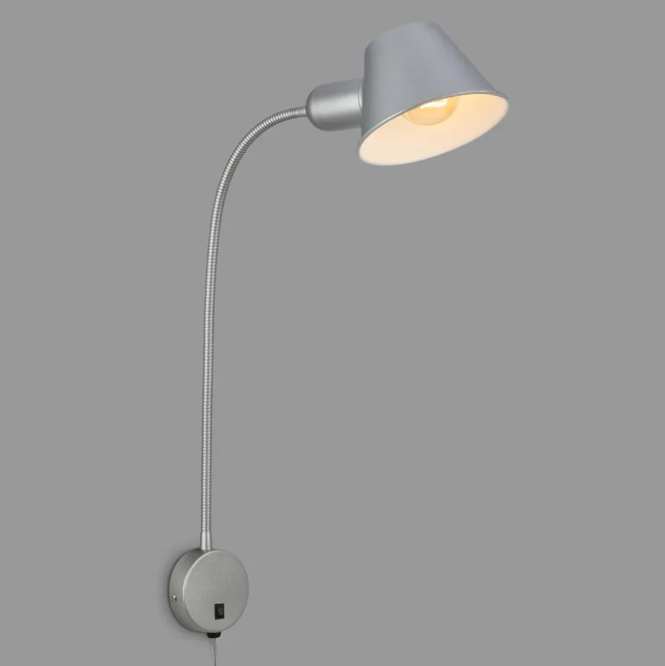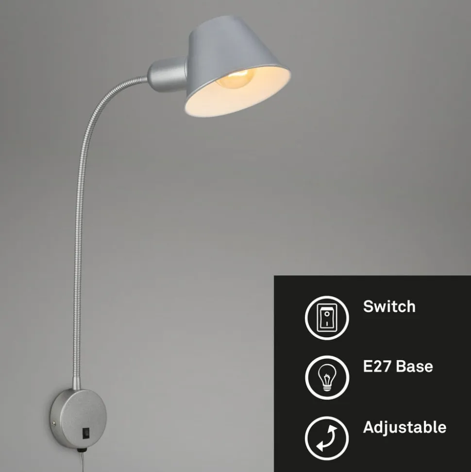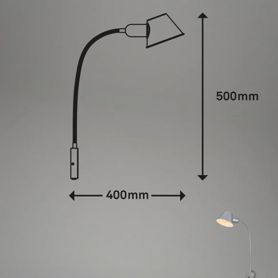 Brello væglampe med fleksibel arm, afbryder og rundt vægbeslag Brello væglampen er en fleksibel lyskilde, især som læselampe ved siden af sengen eller sofaen. Den fleksible arm gør det muligt at rette lyset efter behov. Skærmen, der er formet som en keglestub, indeholder en E27-fatning (pære medfølger ikke) og monteres ved hjælp af et rundt vægbeslag, som også rummer tænd/sluk-kontakten. Udstyret med stikprop.