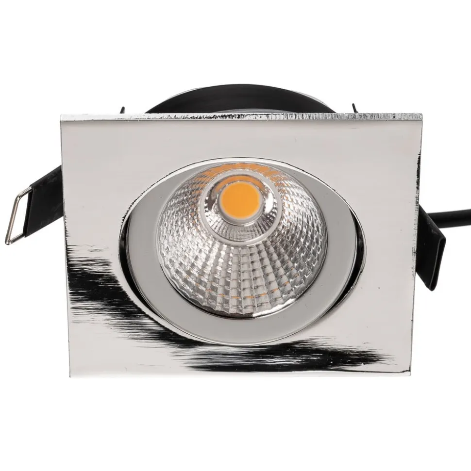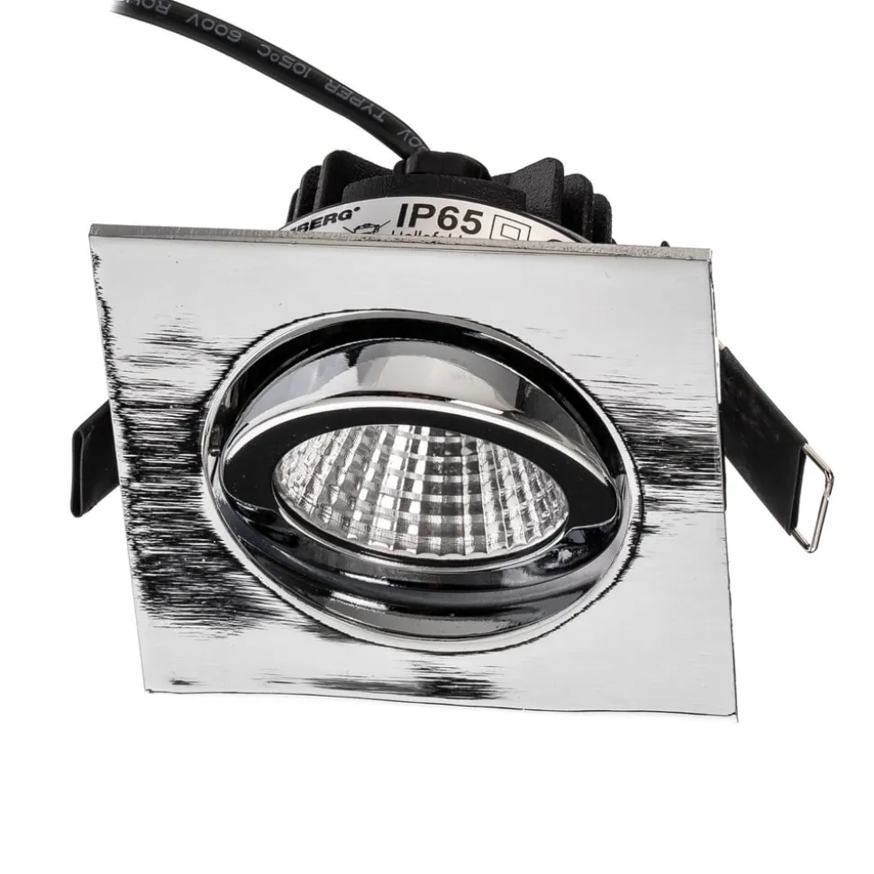 Kvadratisk IP65 indbygget loftslampe med justerbart hoved Med sin enkle, kantede ramme og runde hoved med reflektor harmonerer denne downlight med mange moderne indretninger. Den kan også bruges i f.eks. badeværelser uden problemer takket være dens beskyttelse mod vandstråler. Som praktiske detaljer har IP65 LED-indbygningsspot et justerbart lyshoved og to monteringsfjedre til værktøjsfri fastgørelse i loftsudskæringen – Inkluderer ikke-dæmpbar LED-konverter – Udstrålingsvinkel: 38° – Drejeområde: 30° hele vejen rundt – Loftstykkelse: maks. 2,4 cm