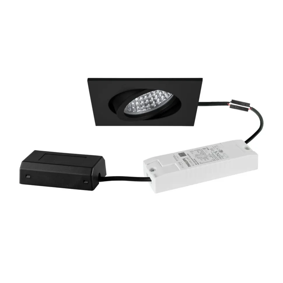 Tirrel-S indbygningsspot med DALI-dæmpbart styreapparat og tilslutningsboks Tirrel ALS er et kvadratisk indbygningsspot med LED, der leveres som sæt med et dæmpbart, elektronisk styreapparat og en tilslutningsboks. Spottet kan monteres i lofter uden brug af værktøj ved hjælp af installationsfjedre, og lampehovedet i huset kan drejes 20° for at justere belysningen. Armaturet med en sølvfarvet reflektorpære med rotationssymmetrisk, smal bredstrålende lysfordeling og den transparente glasafskærmning sikrer optimal lysfordeling og høj lysudbytte – Tilladt omgivelsestemperatur (ta): -20 °C – +25 °C – Beskyttelsesklasse (EN 61140): II, kapslingsgrad (DIN EN 60529): IP20 – med elektronisk forkobling, DALI-2 dæmpbar – med tilslutningsboks – uden synlig snapring