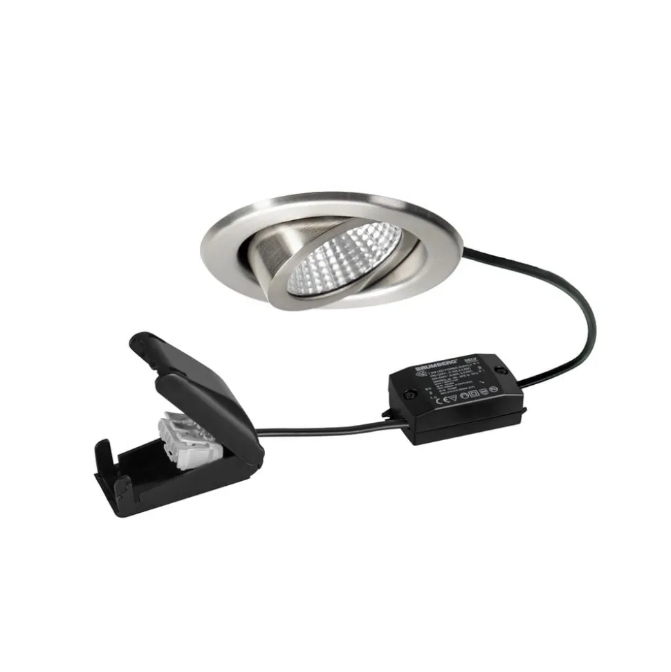Indbygget LED-spot BB09, drejelig, med omskiftelig LED-driver og tilslutningsboks Det runde indbyggede LED-spot BB09 i rustfrit stål og aluminium med en transparent plastafdækning er udstyret med varmhvide LED’er. Disse er placeret i et armaturhoved, der kan bevæges til alle sider for at sikre, at lyset rettes efter behov. Udstyret med en sølvfarvet reflektor med rotationssymmetrisk dyb- og bredstrålende lysfordeling og den transparente afdækning fordeles lyset optimalt. Det enkle indbygningsspot harmonerer med moderne indretningskoncepter og er det ideelle downlight til kommercielle og private områder, for eksempel over køkkenbordet, i entreen eller i stuen. Takket være monteringsfjedre kan indbygningsspottet monteres uden værktøj – med tilslutningsboks, 3-polet til gennemfortrådning – inklusive ikke-dæmpbar, elektronisk styring – udstrålingsvinkel: 38° – drejeområde: 25° hele vejen rundt – må ikke dækkes med varmeisolerende materiale