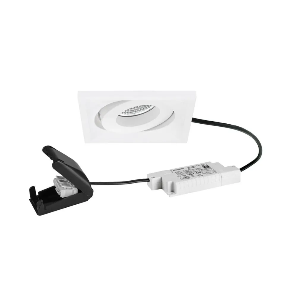 LED-indbygningsspot BB36 med LED-driver, dæmpbar og tilslutningsboks LED-indbygningsspot BB36 med firkantet ramme kan drejes 20° hele vejen rundt for at rette lyset og kan monteres i loftet uden værktøj ved hjælp af monteringsfjedre. Den leveres som et komplet sæt med en betjeningsenhed, der kan dæmpes med en bagkantsfasedæmper (RC), og en tilslutningsboks. Spottet er udstyret med en sølvfarvet reflektor med rotationssymmetrisk, smal og bredstrålende lysfordeling, så lyset er kraftigt og fordeles optimalt gennem den transparente polykarbonatafdækning – inkl. elektronisk styreapparat, bagkantfasedæmpbar – inkl. tilslutningsboks, 3-polet til gennemfortrådning – tilladt omgivelsestemperatur (ta): -20 °C – +25 °C – spottet kan drejes 20° hele vejen rundt – maksimal loftstykkelse 1,5 cm