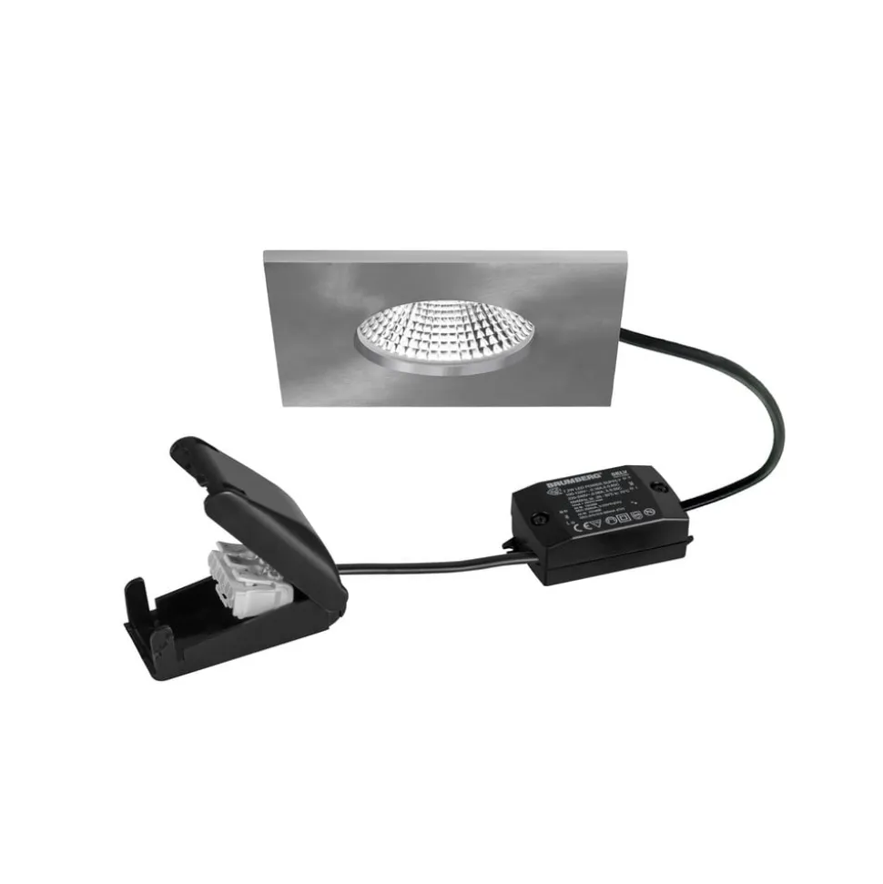 BB21 IP65 LED-indbygningsspot med omskiftelig LED-driver og tilslutningsboks BB21 LED-indbygningsspot i vinkelform kan installeres i badeværelser, wellnessområder osv. takket være IP65-beskyttelsesgraden. Downlighten kan monteres uden værktøj ved hjælp af monteringsfjedre, kan installeres i lofter med en tykkelse på op til 1,7 cm og er ikke dæmpbar. Den udsender varmt hvidt lys i en vinkel på 36°, som fordeles optimalt gennem den gennemsigtige plastafdækning af den sølvfarvede reflektor med rotationssymmetrisk, dyb lysfordeling.