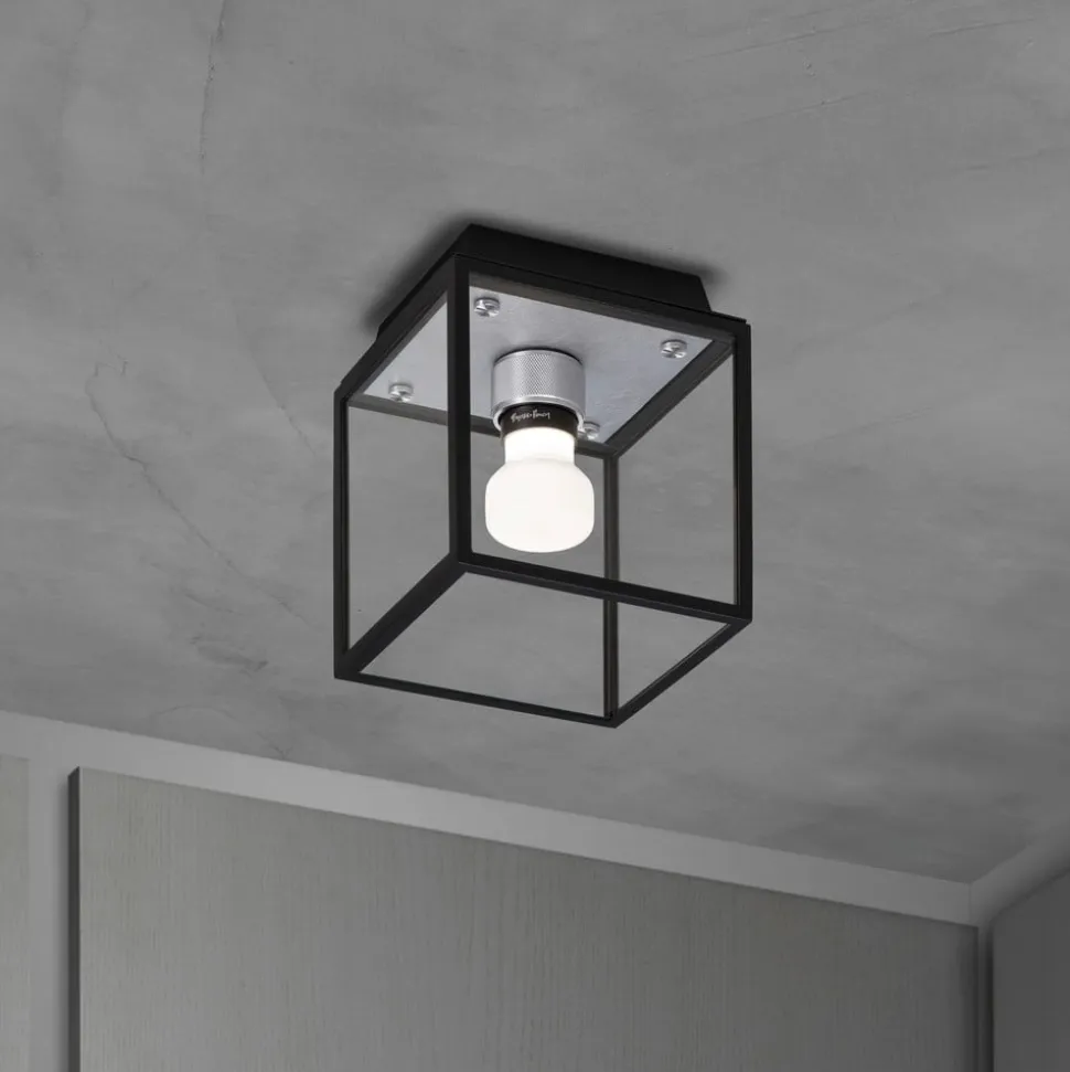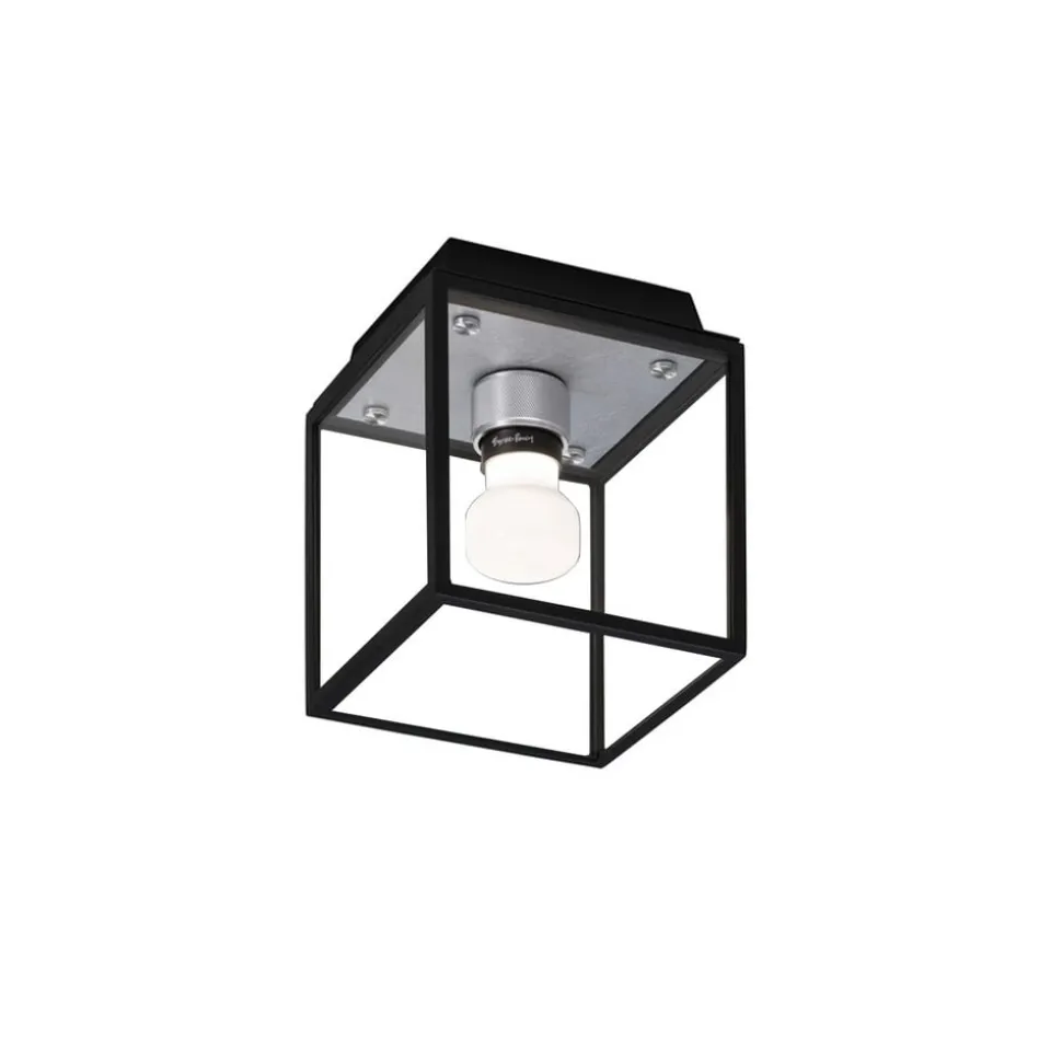 Caged Wet Lille designerloftslampe til badeværelser og udendørsarealer Denne loftslampe med bur består af et mat sort metal- og glasbur med en bagplade i støbt metal. Den har en solid metalfatning med tværgående rifling og karakteristiske møntskruer. Armaturet har en IP44-beskyttelsesgrad, hvilket betyder, at det er egnet til fugtige rum, badeværelser og udendørs brug. Metalbagpladerne har en unik patinering, overfladestruktur og støbemærker, der fortæller historien om, hvordan de blev lavet, og sikrer, at de er fulde af karakter. Dette armatur kan monteres på væggen eller i loftet.