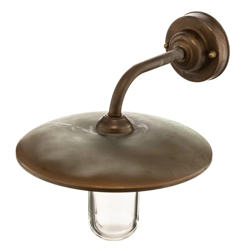 Klassisk CASALE udendørs væglampe i kobberlook CASALE udendørs væglampe imponerer med sin enkle elegance. Den brede skærm beskytter det klare glas og reflekterer lyset, så det skinner nedad og oplyser udendørsområdet over et bredt område. Hovedmaterialet er antik messing med en finish i kobberlook. IP44-beskyttelsesgraden gør denne væglampe ideel til udendørs brug. Den kan derfor med fordel bruges som stibelysning eller i indgangspartier.