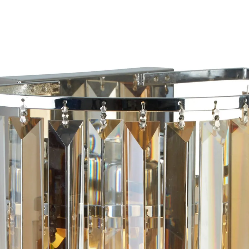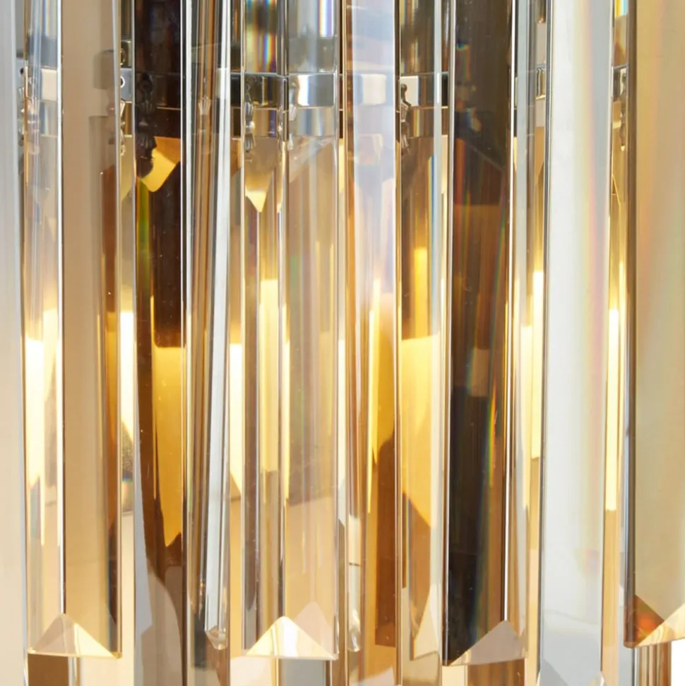 Halvcirkelformet Clarissa-væglampe med krystalprismer i tre farver Den halvcirkelformede skærm på Clarissa-væglampen er lavet af et forkromet metalstel, som er beklædt hele vejen rundt med krystalprismer i klar, smoke og creme. Når lyset er tændt, opstår der smukke refleksioner. Denne væglampe, som også fungerer som et dekorativt objekt i rummet, når den er slukket, ser fantastisk ud alene, men kan også placeres i par eller – monteret i en række – tilstrækkeligt belyse en lang korridor. – eksternt dæmpbar
