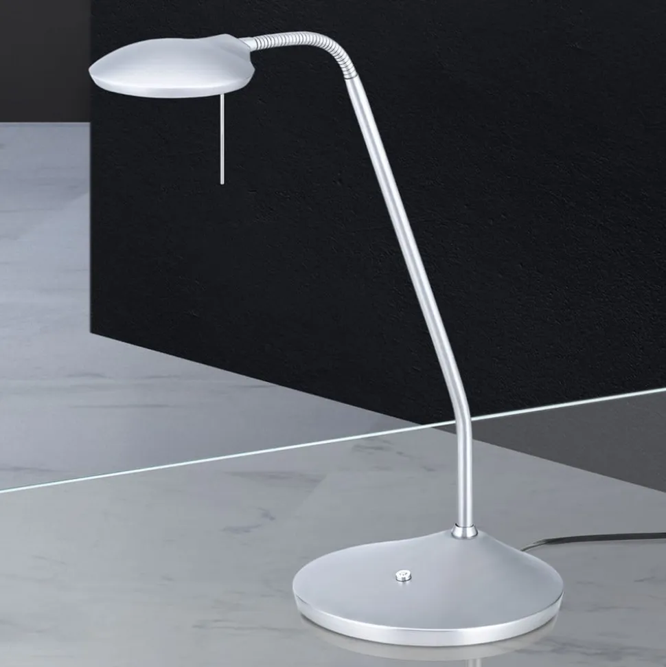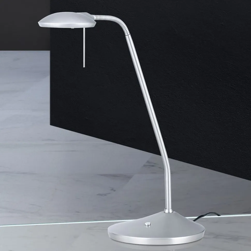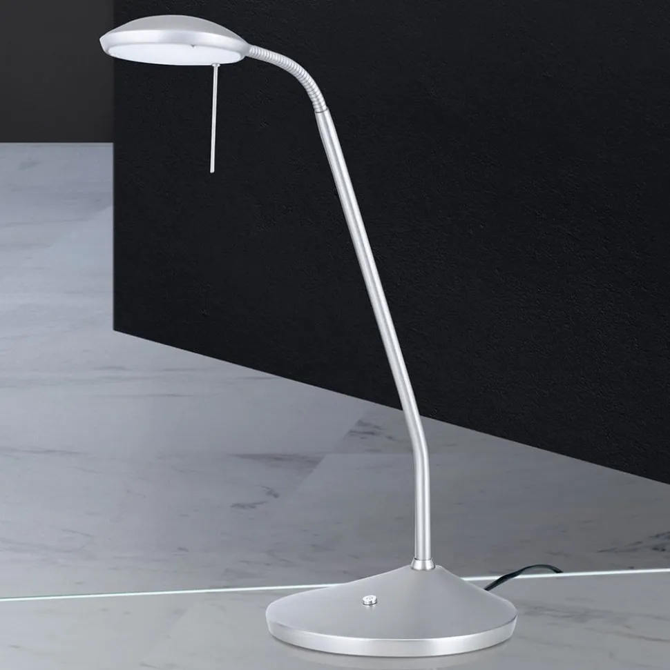 LED-bordlampen Cobra er med sin matte nikkelfarvede overflade tidløst smuk, så glæden ved denne behagelige lyskilde varer længe.