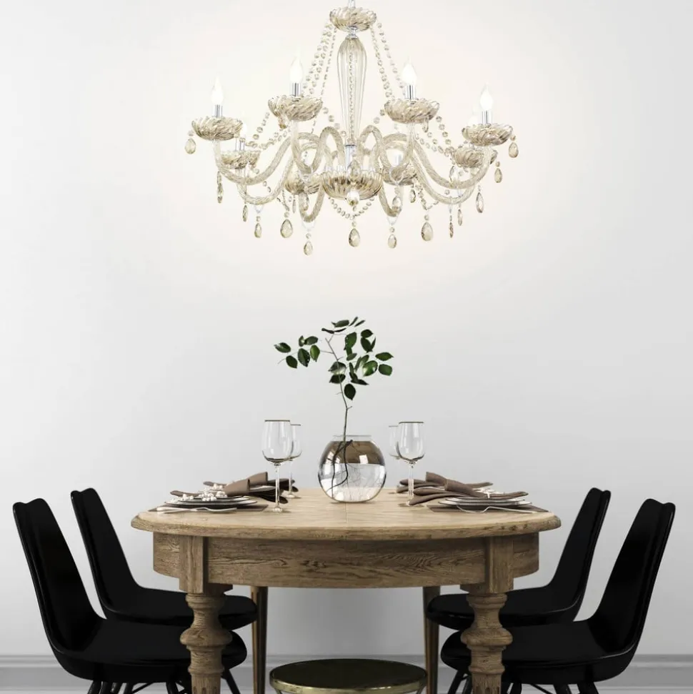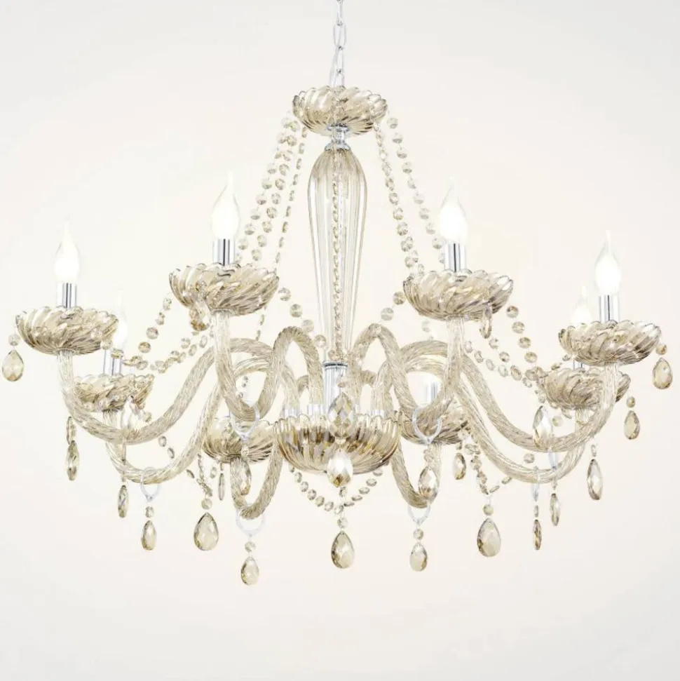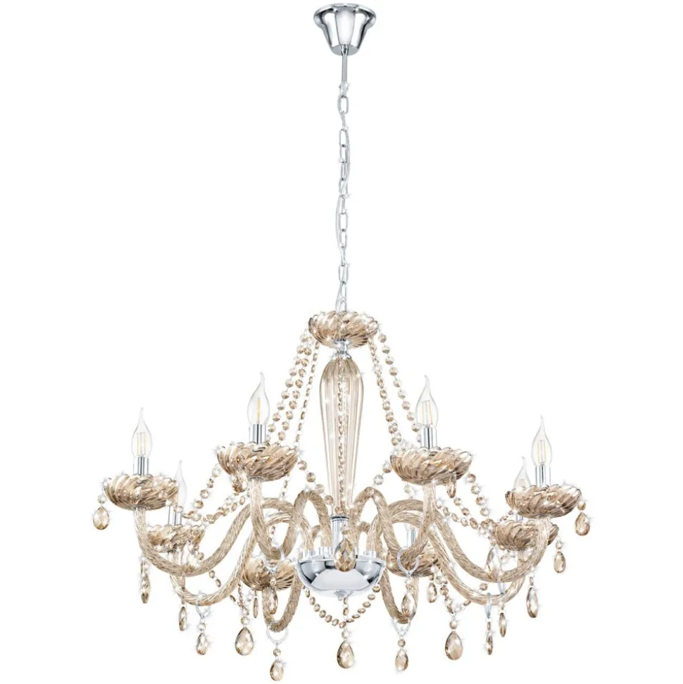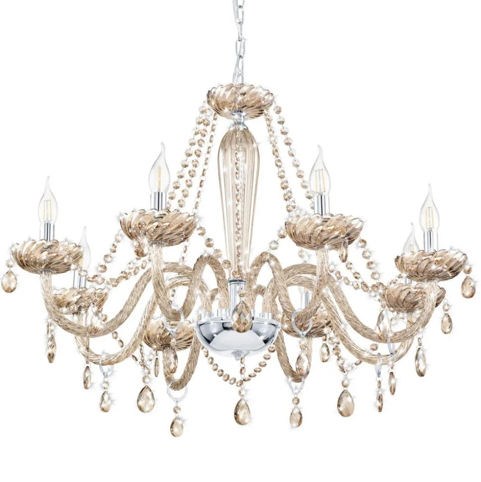 Lysekronen Basilano begejstrer med sit elegante design, som præges af dens otte kurvede arme af cognacfarvet glas. Herfra hænger der yndefuldt forarbejdede glassten, som tilfører den samlede fremtoning en meget charmerende karakter. Lægger man så de i krom skinnende E14-fatninger og lampens halvrunde midte, som ligeledes er holdt i krom, virker det hele visuelt endnu mere prangende.
