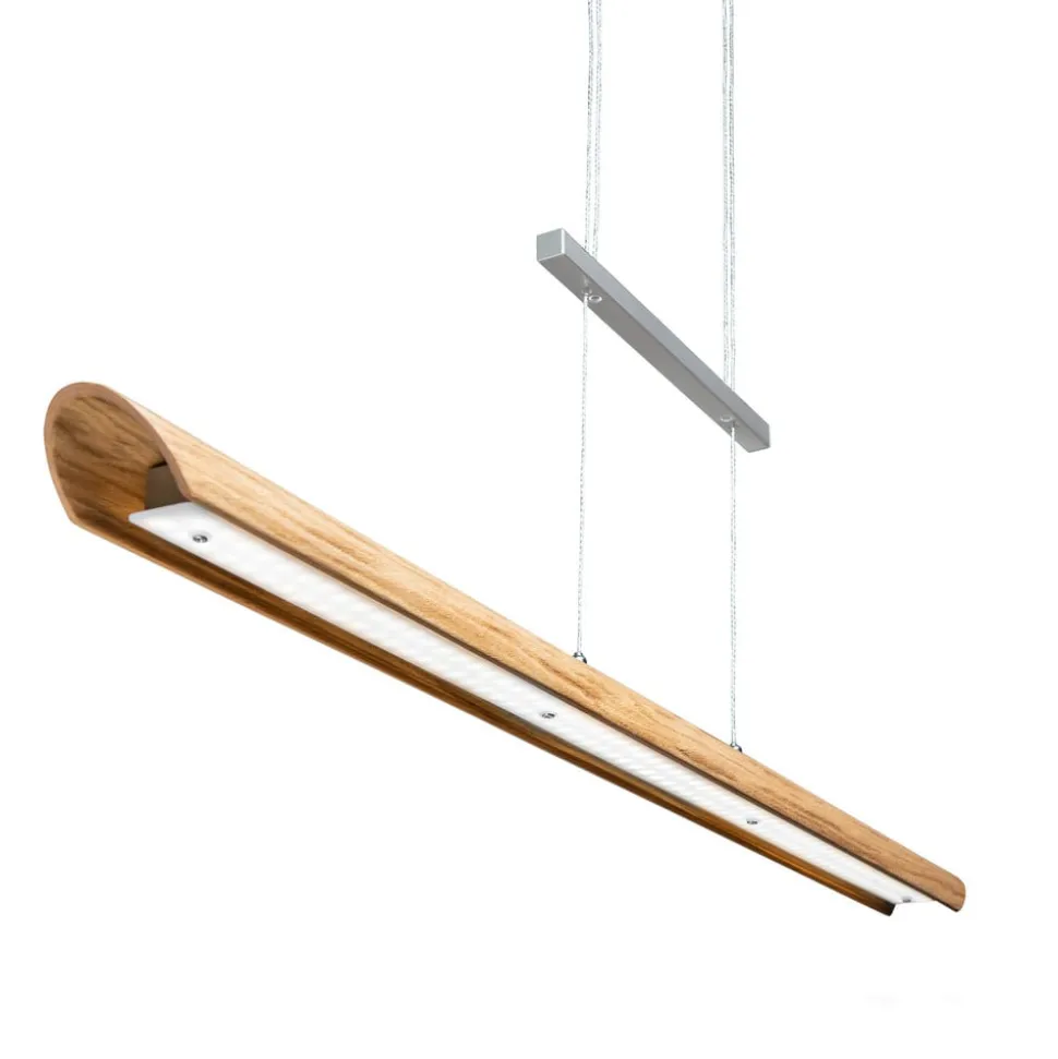 Det moderne og tynde LED-pendellampe Colombia S er fremstillet i Tyskland. Den består af et elegant design, der kombinerer træ med moderne LED-teknologi. baldakin og lampeskærmen er lavet af naturstøbt træ. De nedadgående lysdioder kan ændres i farvetemperatur over tre niveauer fra en varm til kølig skygge og kan også dæmpes. Dette gøres meget let ved hjælp af to separate berøringsafbrydere, der er placeret direkte på lampeskærmen. Colombia S er ideel til belysning over borde og kan let justeres i højden. En enkel mekanisme gør det muligt at justere lampen fra 80 til 160 cm, mens lampen er i drift.
