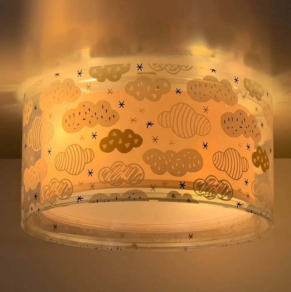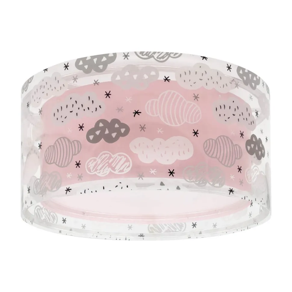 Cloud Pink loftslampe Cloud Pink loftslampen imponerer med sit børnevenlige motivdesign på skærmens overflade. Den dobbeltlagede og transparente skærm er pink og trykt med forskellige skymotiver, som er særligt effektfulde, når de er tændt. Bemærk: Skærmen er ikke formonteret og skal samles før brug – se brugsanvisningen. Link til producentens monteringsvideo: https://www.youtube.com/watch?v=3P-s2Xw7TKM