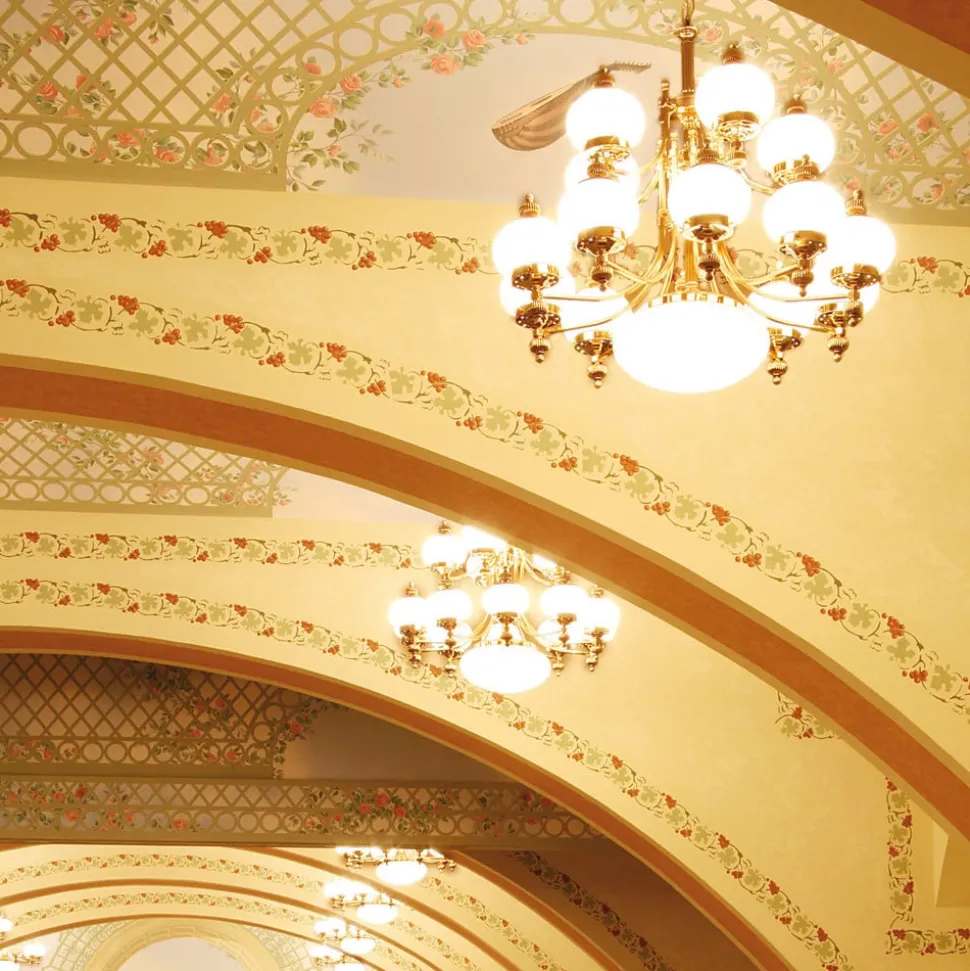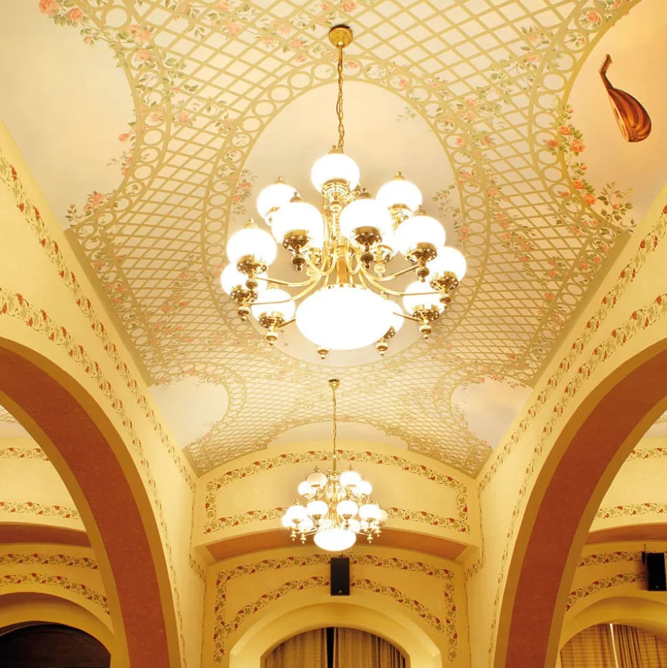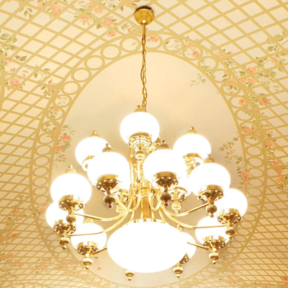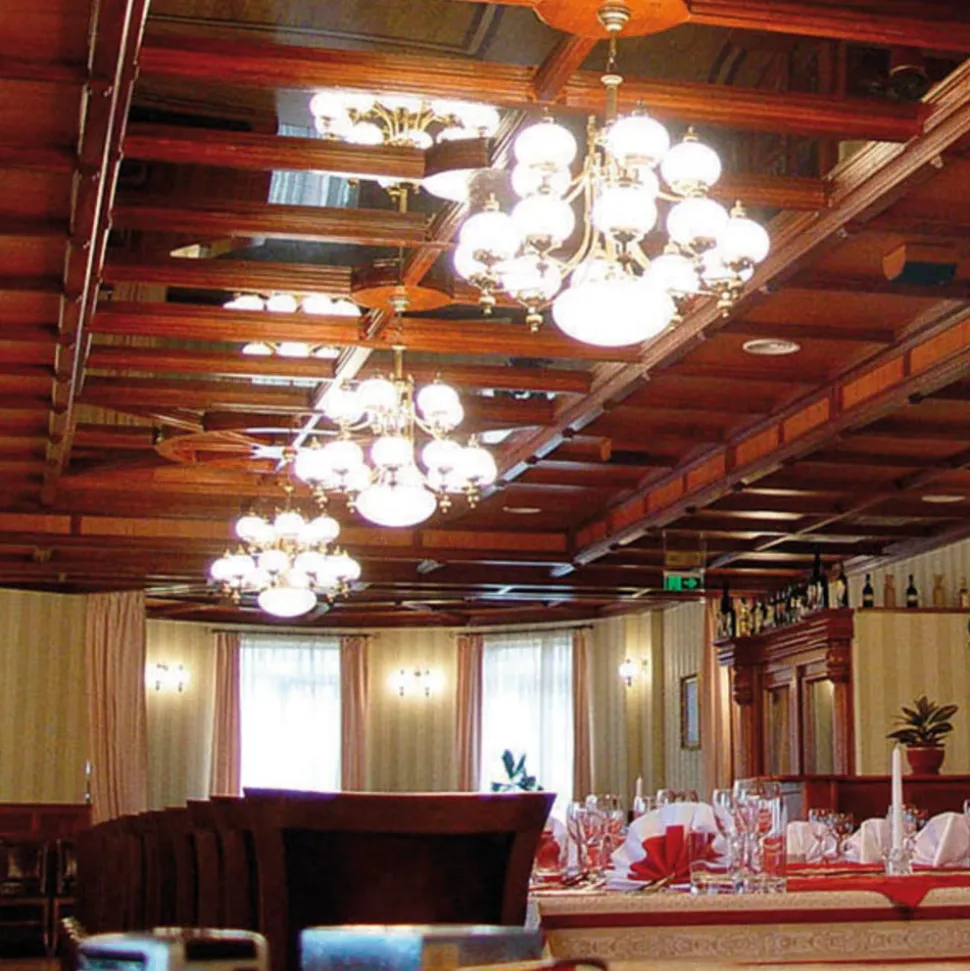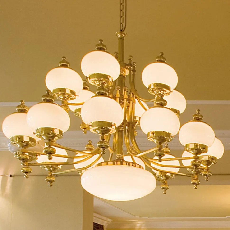 Imponerende Delia lysekrone med seksten opale glasruder Delia lysekronen er et blikfang af særlig kvalitet. Den er arrangeret i to niveauer og har derfor en imponerende højde på 90 cm. Lampestellet er lavet af massiv messing. Med sin skinnende overflade og fine ribbestruktur skaber den en raffineret elegance. Flairen fra et gammelt wienerkaffehus fremkaldes af de pæreformede lampeskærme af opalglas. En stor lampeskærm på undersiden forbedrer det effektive udseende. Glasset skaber en blændfri og lys lysstemning i rummet. Med sit smukke, hyggelige lys kan dette attraktive belysningstilbehør stadig forbedre en eksklusiv café i dag. Delia er også velkommen som et imponerende blikfang i en privat stue. Lysekronen kommer til sin ret ved højt til loftet.