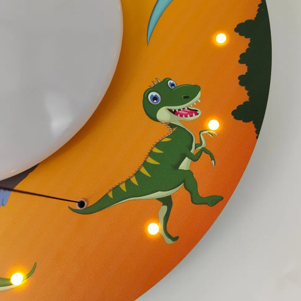 Med trækafbryder: Dinos-loftslampe med stjernehimmel Dinos-loftslampen er velegnet både som generel belysning på børneværelset og i sin funktion som stjernehimmel. 20 individuelle LED’er indlejret i loftspladen funkler som små stjerner. Hovedlyskilden er en E27-fatning (pære medfølger ikke, se tilbehør). Den kan deaktiveres med en trækkontakt, hvis man kun ønsker at lade stjernehimlen skinne. Visuelt har børneværelseslampen, som er halvt gul og halvt rød-orange, forskellige dinosaurer i forskellige farver samt trykte vulkaner og forskellige planter.