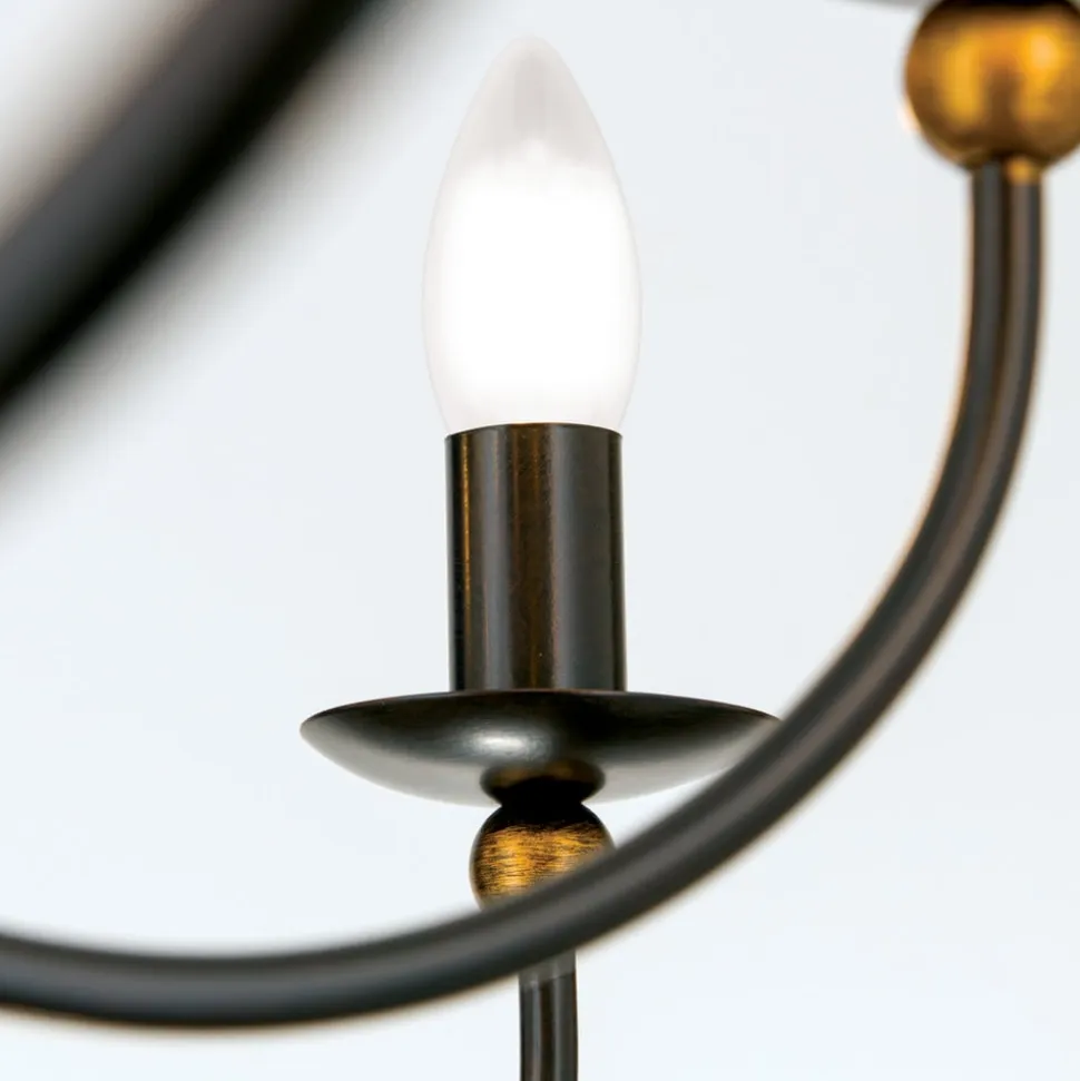 Vellykket smedearbejde med antiklakeret jern giver et herregårdsagtigt snit og en stemningsfuld belysning. De gyldne pyntekugler, som kendetegner hele serien, giver lysekronen en speciel karakter.