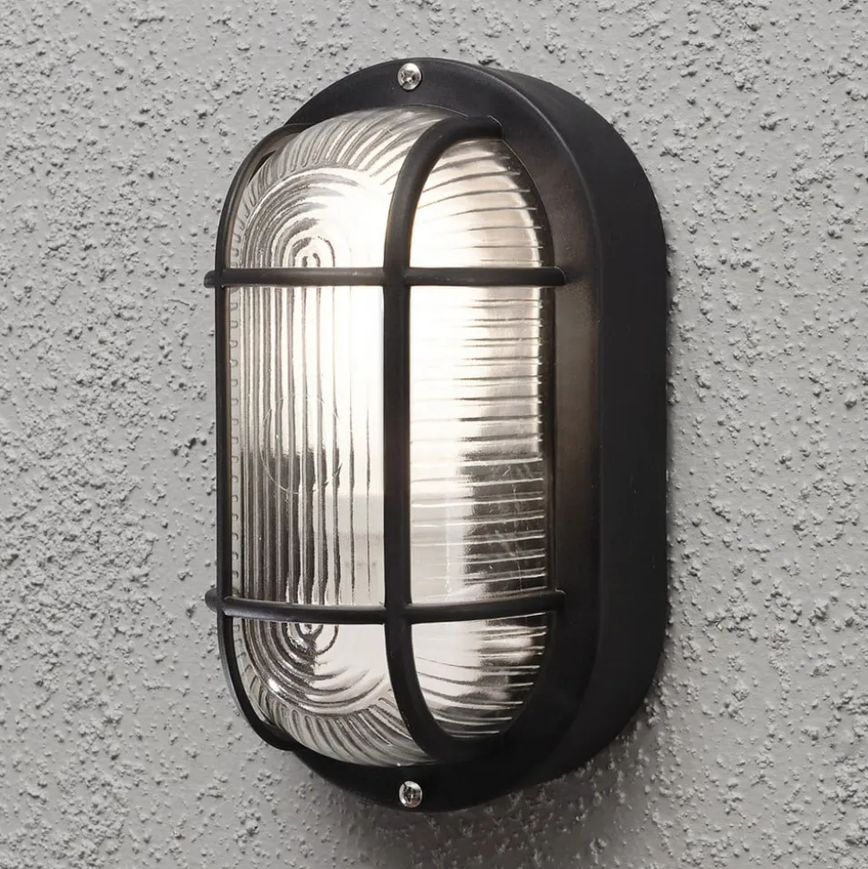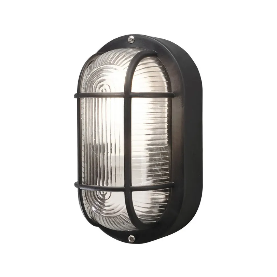 Elmas oval udendørs væglampe med dekorativt glas Det riflede glas på Elmas udendørs væglampe i to forskellige mønstre er beskyttet af et dekorativt designet gitter, som giver lampen et teknisk look. Væglampen er beskyttet mod indtrængen af støv og stænkvand på alle sider med en IP44-beskyttelsesgrad. Dette marinearmatur kan derfor bruges udendørs, men også i f.eks. fugtige kældre.