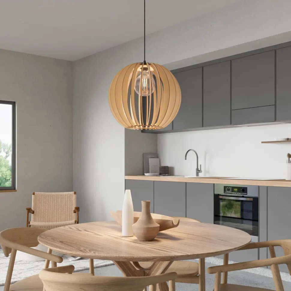 1 lyskilde-hængelampe Clay med skærm af FSC-certificeret birkekrydsfiner Skærmen består af enkelte træelementer og er formet som en kugle. Træelementerne er monteret forskudt, hvilket skaber mellemrum, der giver mulighed for at se lyset inde i skærmen. Dekorative pærer er derfor særligt velegnede til belysning.