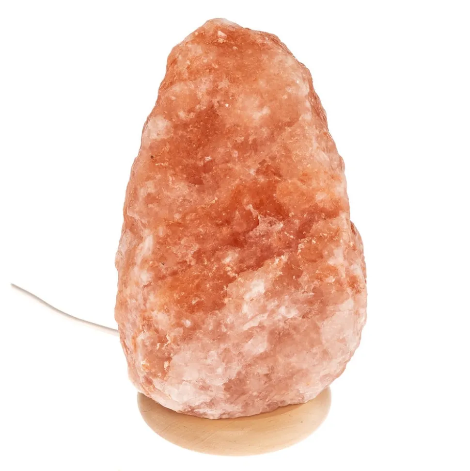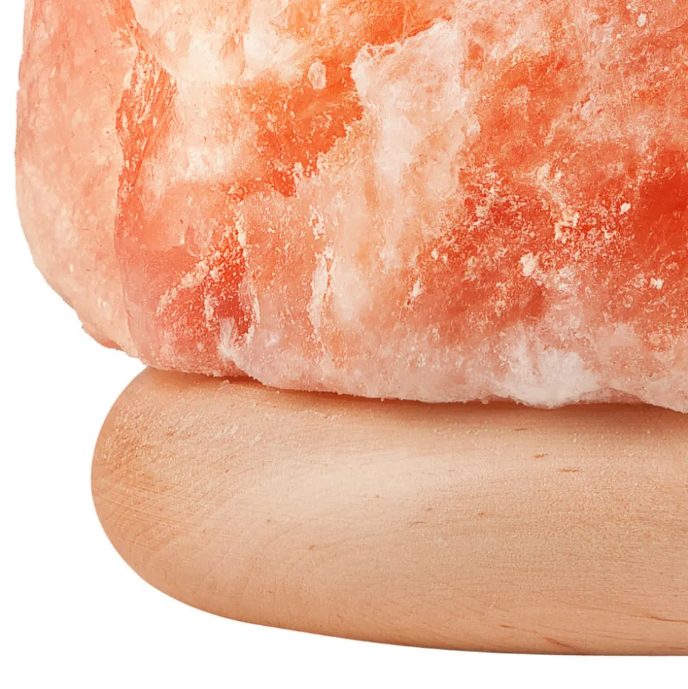 Harmony bordlampe af rustik, naturlig saltkrystal med lys træfod Den typiske, behageligt varme lysstemning fra en saltlampe forstærkes yderligere af den runde fod af lyst træ. Den rødlige saltsten lader lyset fra pæren, som kan bruges indeni, skinne blidt igennem. Saltkrystallen er brudt fra en større blok og efterladt i sin naturlige tilstand, så hvert eksemplar har individuelle farve- og formnuancer, og størrelsen kan variere lidt – Produceret i Europa; håndterbare transportruter og reduceret CO2-udledning – FSC®-certificeret træ – plastfri emballage med genbrugsmateriale