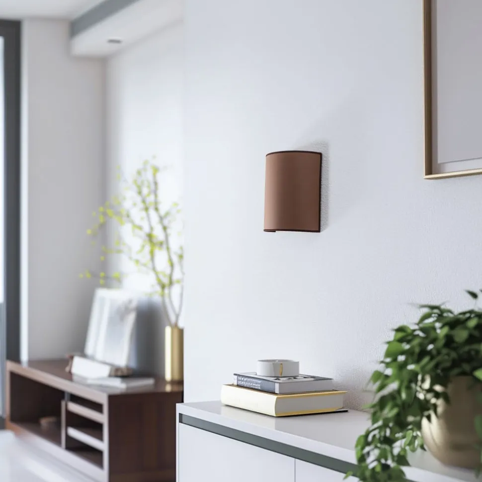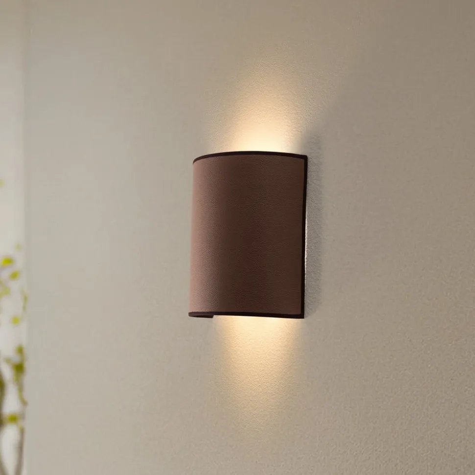 Idun halvcirkelformet væglampe – vegansk lampeskærm lavet af æbleskræl Idun-væglampen, der er produceret i Europa, er udstyret med en brun lampeskærm i form af en halvcylinder. Den er lavet af et vegansk kunstlæder fremstillet af æbleskræl og har en behagelig, naturlig fornemmelse. Lyset sendes både opad og nedad.