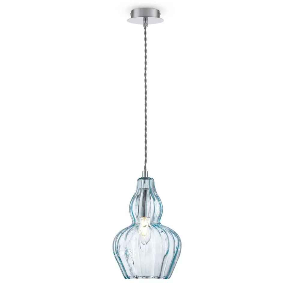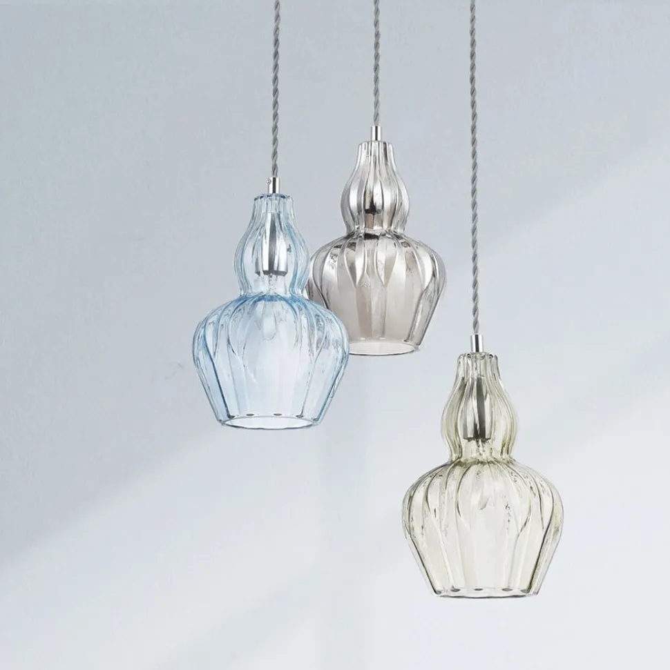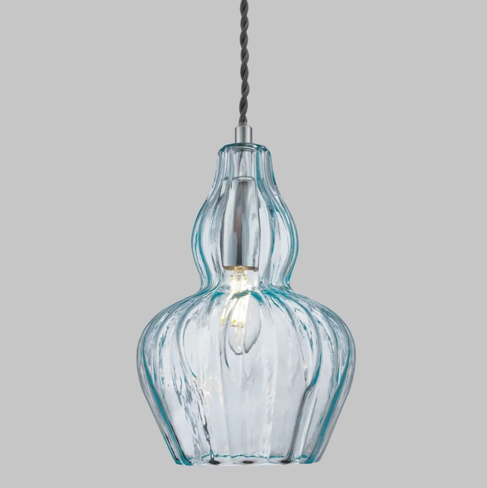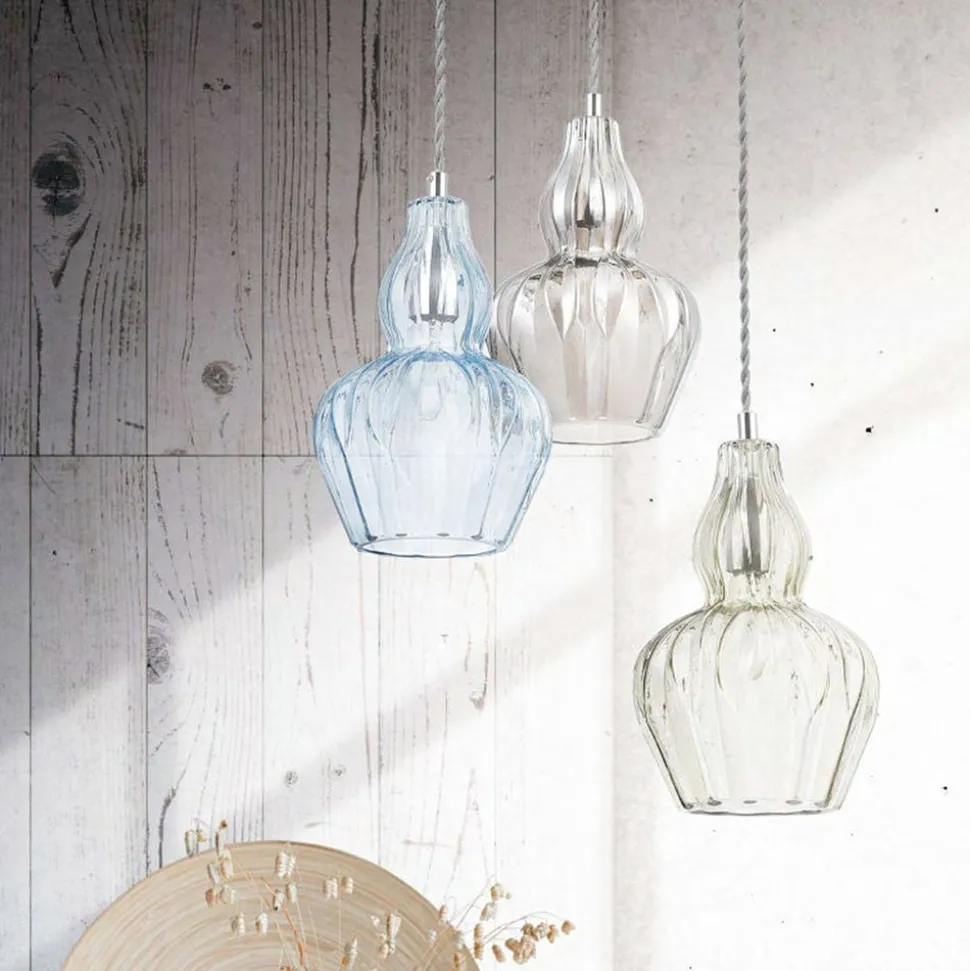 pendellampe Eustoma præsenteres med et metalstik, der hænger i en snoet ophængning, der er omgivet af en imponerende smuk glasskærm. Skyggen er ikke kun tiltalende på grund af sin ekstravagante form, men også på grund af dens farvede gennemsigtighed, hvilket også giver lyset, der udsendes i alle retninger, en særlig flair.