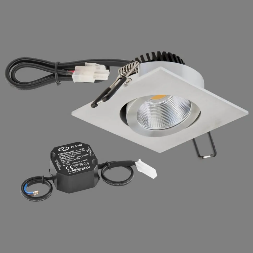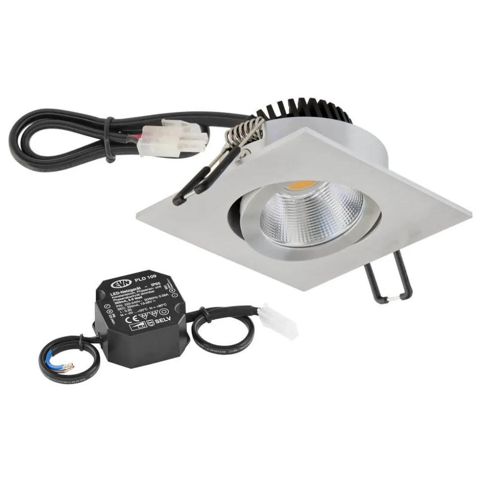 Firkantet og drejelig LED-indbygningslampe PC20 med strømforsyning LED-indbygningslampen PC20 er ikke kun drejelig. Den har også et 30 cm langt tilslutningskabel med AMP-stik og er også velegnet til møbelkonstruktion. Den kraftige COB-LED giver pålideligt god belysning i hele rummet. Det pulverlakerede aluminiumshus er slankt og afrundet af et klart glaspanel. Ideel som spotlight, til effektbelysning eller som klassisk downlight i række – egnet til møbelkonstruktion (brandbeskyttelsesmærke MM) – COB LED – inkl. LED-strømforsyning (tilslutningskablets længde 15 cm) – dæmpbar via forkant- og bagkantfasedæmper